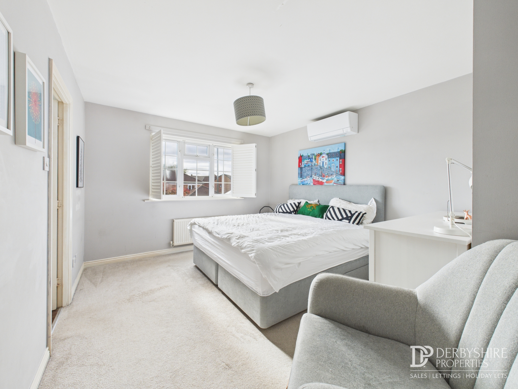 With a double-glazed window to the front elevation fitted with bespoke shutter blinds, the room features a wall-mounted radiator and an air-conditioning unit providing both cooling and heating. An internal door provides access to: