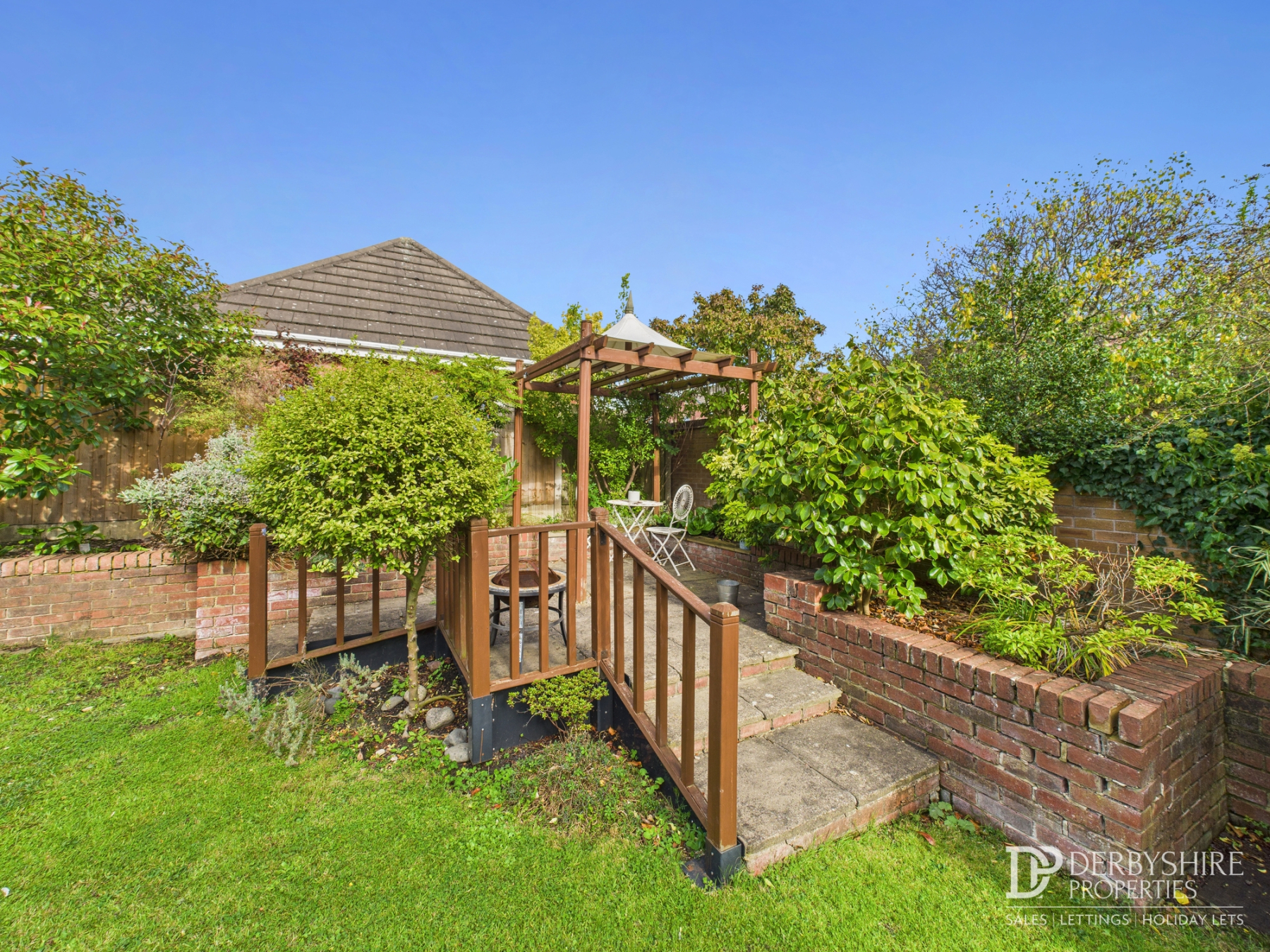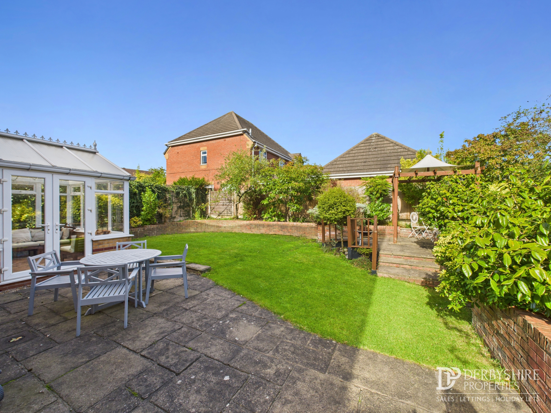 The rear garden features a large paved entertaining terrace, ideal for outdoor dining, alongside a well-maintained lawn with raised stocked flower beds and borders, retaining walls, and timber-fenced boundaries, all complemented by mature planting to neighbouring properties. A further entertaining terrace with a pergola offers an additional outdoor space, complete with outside security lighting and a water tap.