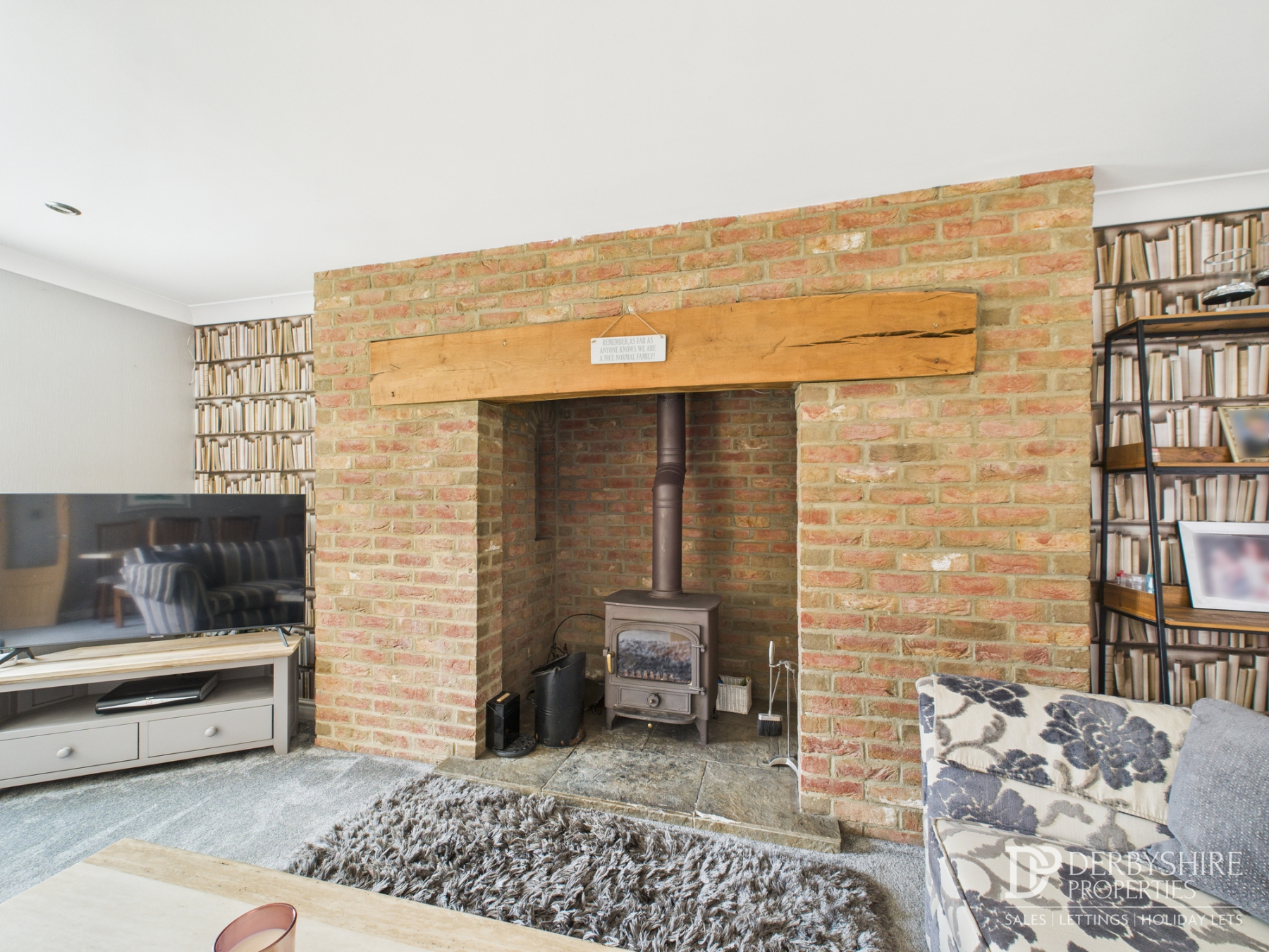 5.90m x 5.39m (19' 4" x 17' 8") A cosy yet spacious lounge with double glazed arched windows to side elevation, carpeted flooring throughout and traditional inglenook fireplace housing multi fuel burner on raised hearth. Internal oak framed bi fold doors open to;