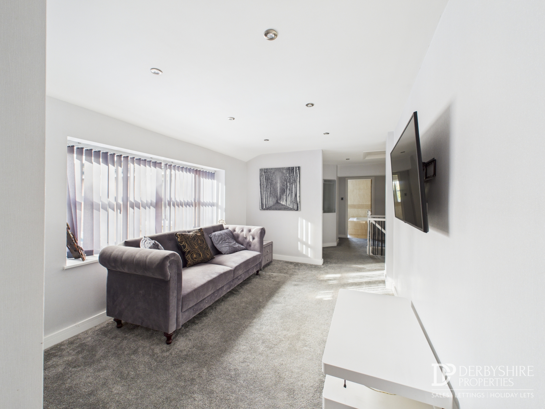 Impressive landing space including cinema seating area, large double glazed window overlooking rear garden, carpeted flooring and wall mounted radiator. Fitted cupboard provide additional storage capacity whilst doorways access;