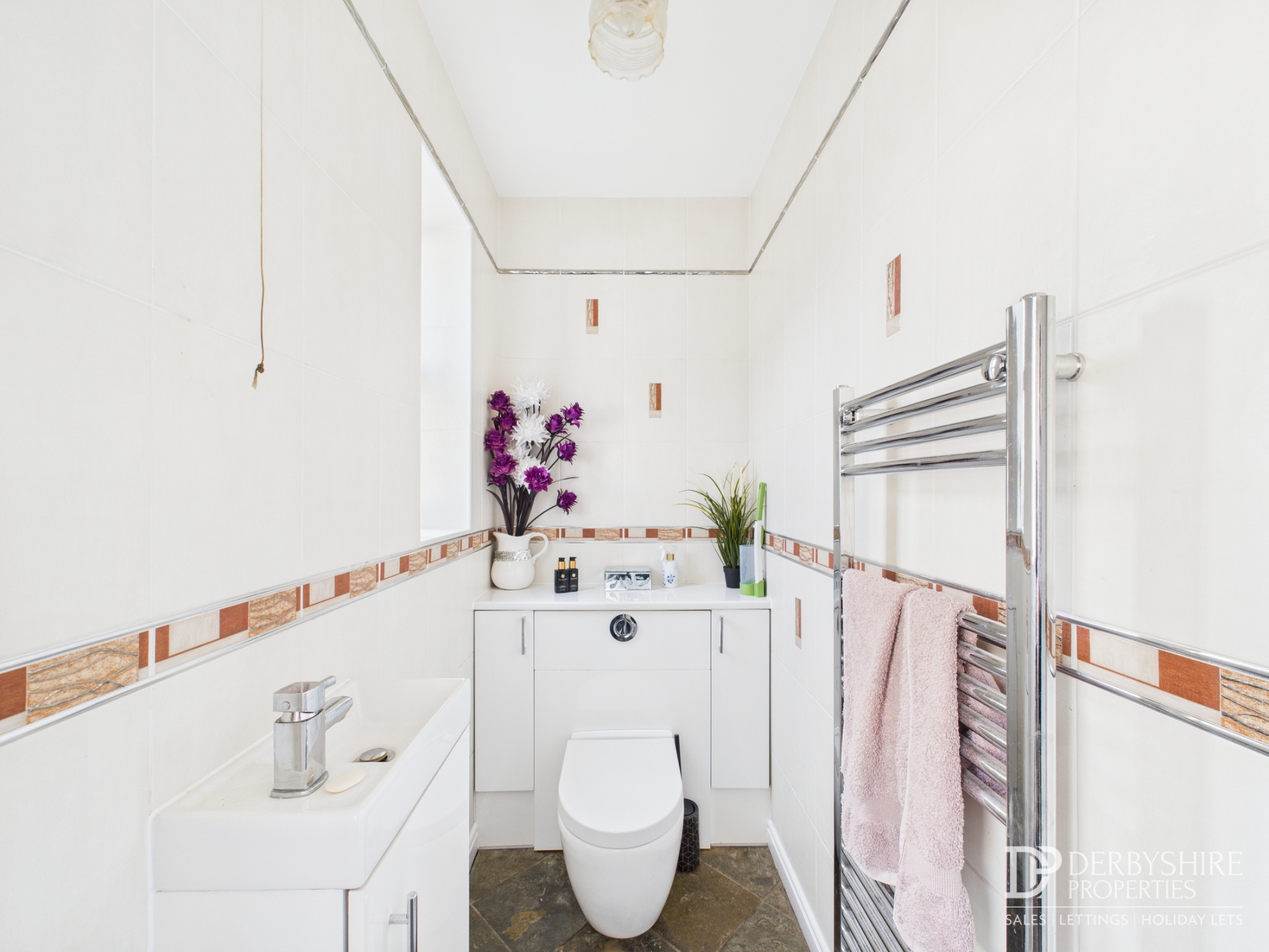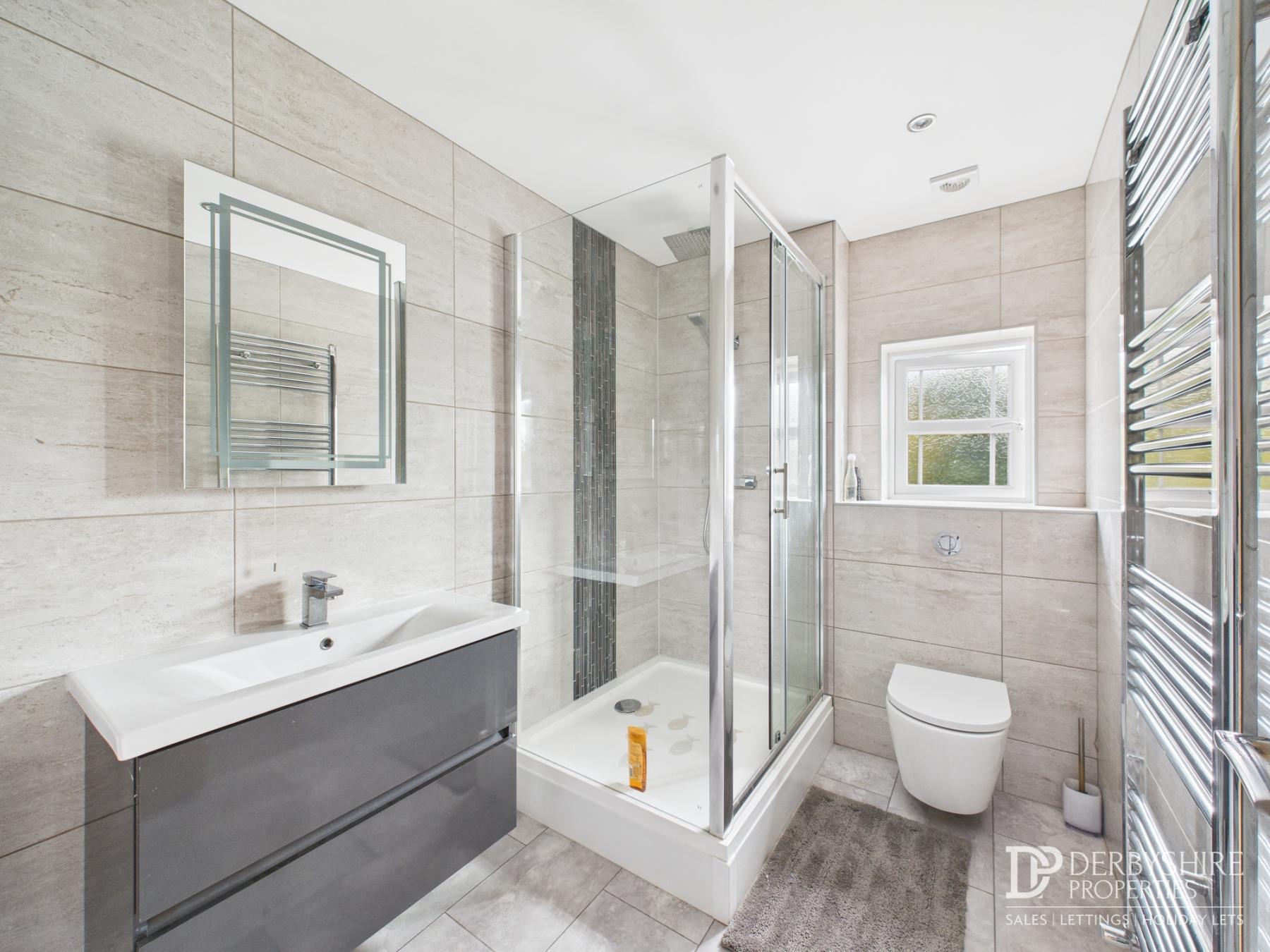A tiled three piece suite including; Corner shower cubicle, wall mounted vanity handwash basin and low level WC. Wall mounted heated towel rail, LED mirror and ceiling fitted extractor unit complete the space.