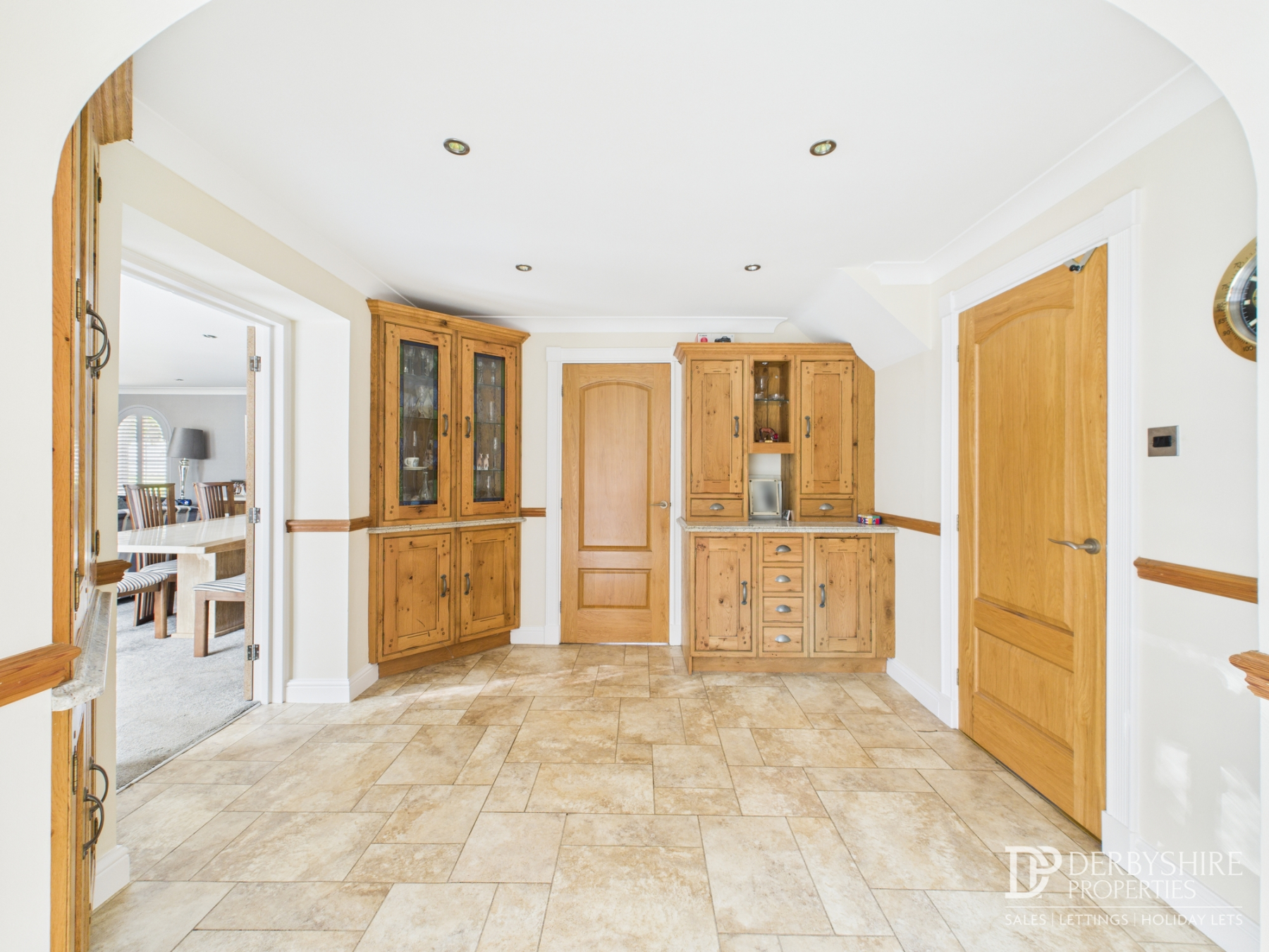 Housing sideboard and two further corner units with granite detailing, this space has tiled flooring and doorways to;
