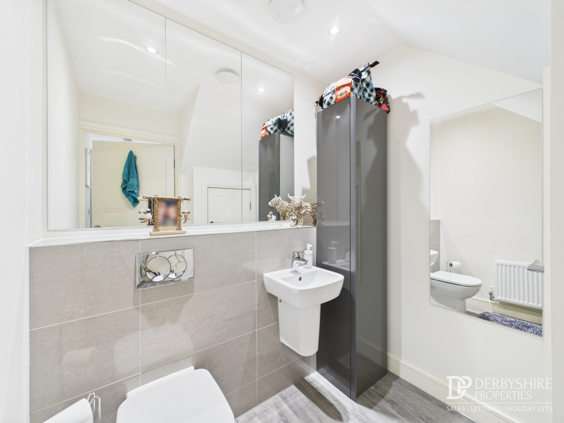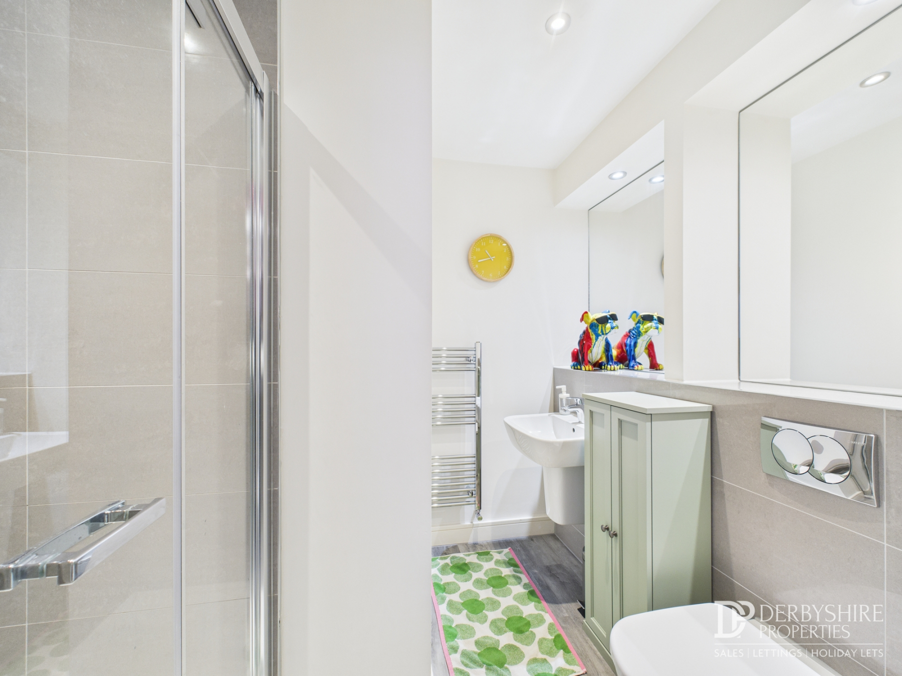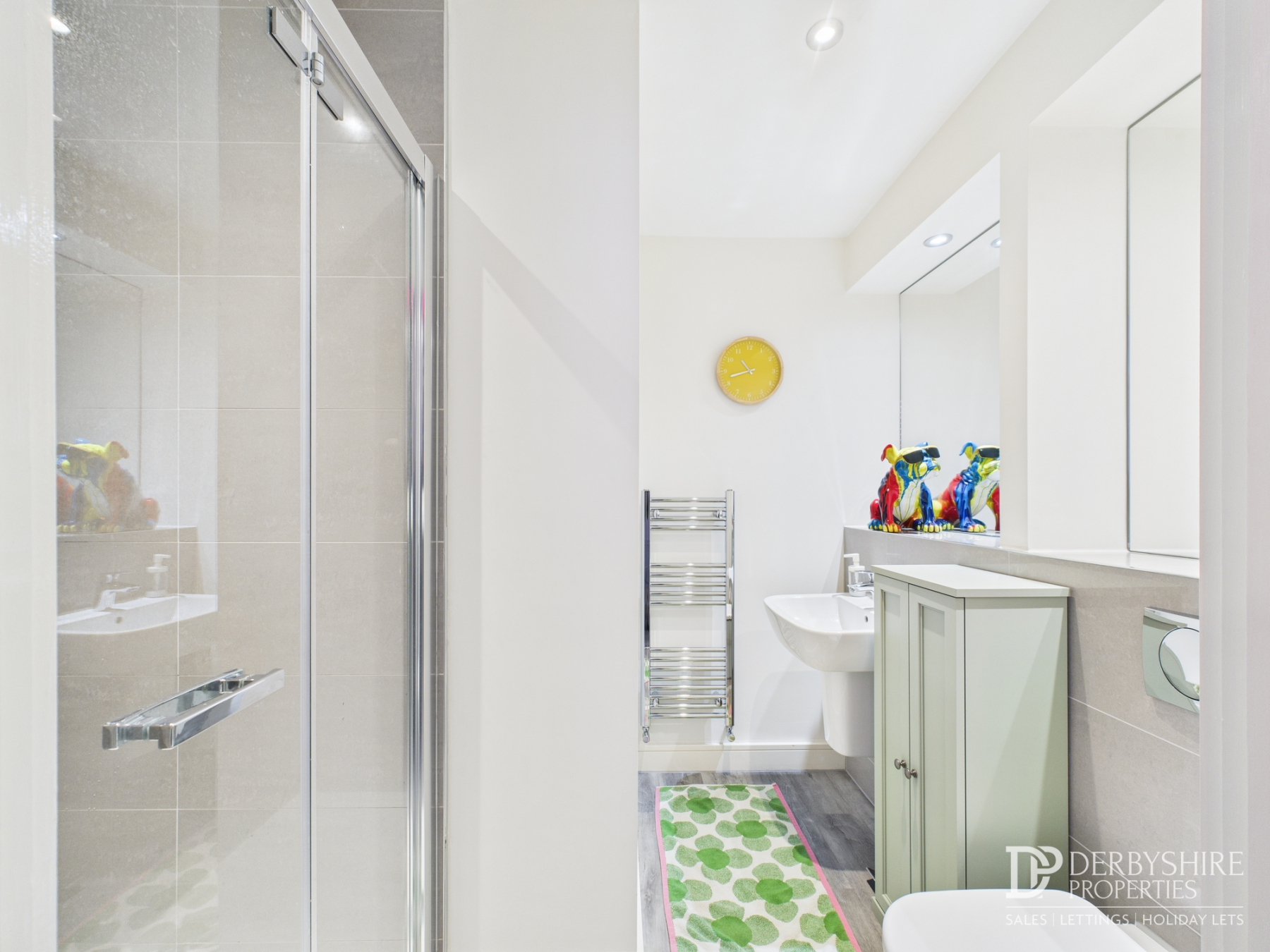 2.29m x 0.86m (7' 6" x 2' 10") A tiled three piece suite including; Walk-in shower, wall mounted handwash basin and low level WC. Wall mounted heated towel rail, dual mirrors and ceiling fitted extractor fan completes the space.