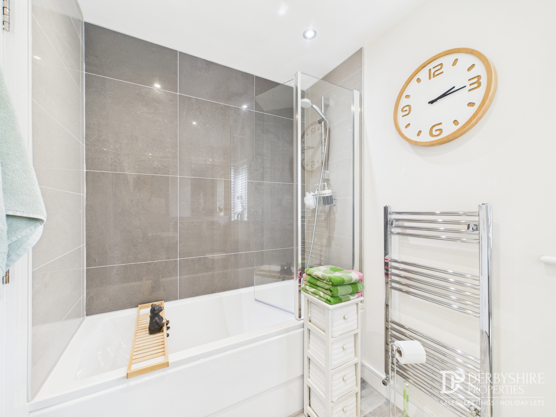 2.36m x 1.66m (7' 9" x 5' 5") A stylish three piece suite including; Bath with shower screen and attachment, wall mounted handwash basin and low level WC. Wall mounted heated towel rail, double glazed obscured window to rear elevation, dual mirrors and ceiling fitted extractor fan completes the space.