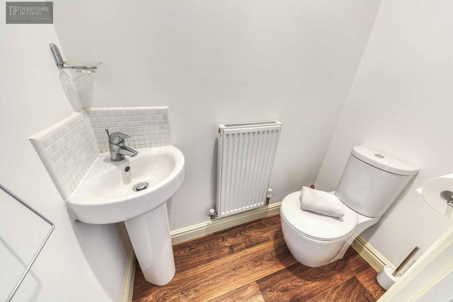 With corner pedestal handwash basin and low level WC. Featuring wood effect flooring, mini wall mounted radiator and ceiling fitted extractor unit.