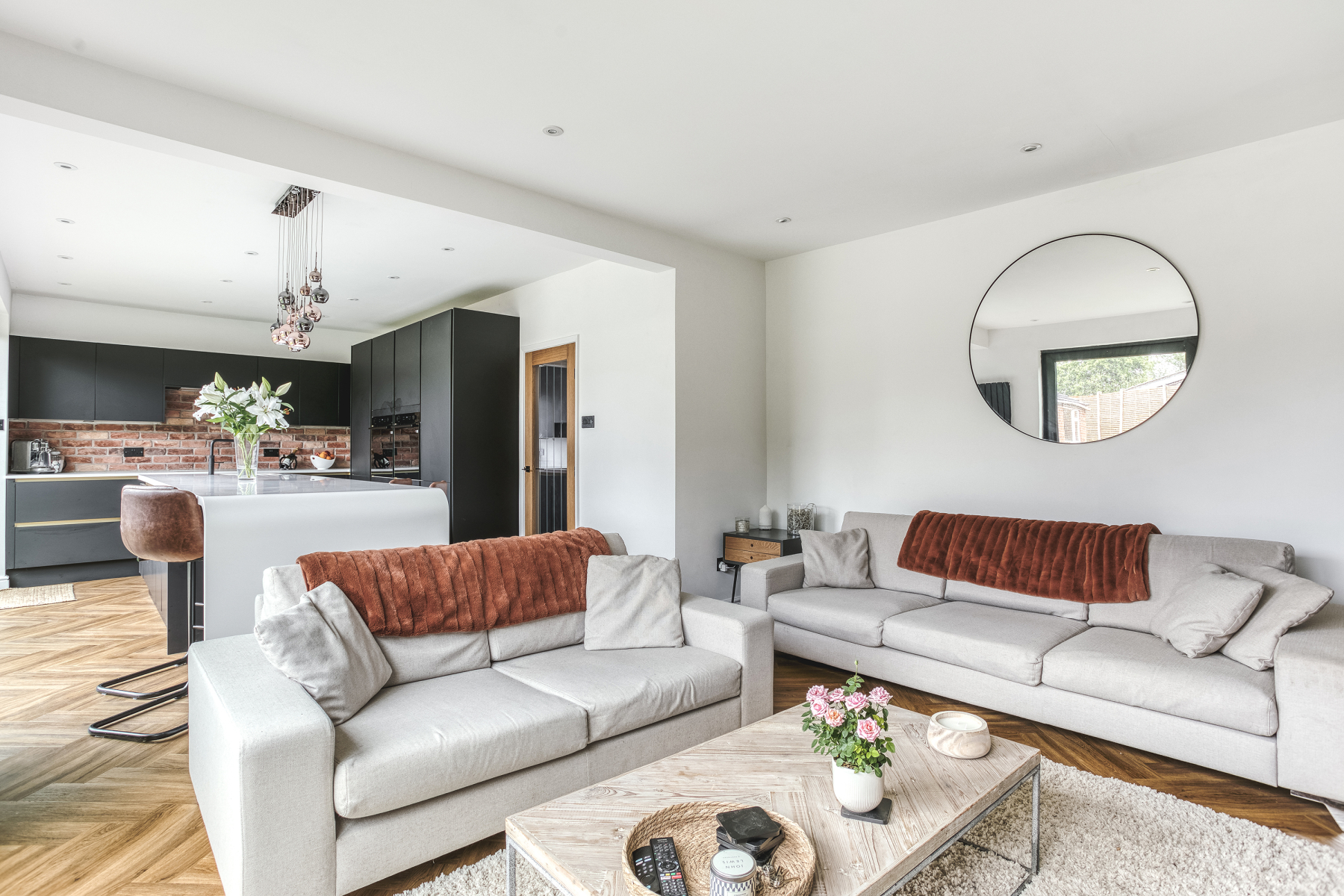 This beautifully styled light and airy living room benefits from windows to the front and side elevations incorporating French doors to the front aspect. LVT herringbone floor covering, TV point, decorative coving and wall mounted radiator.