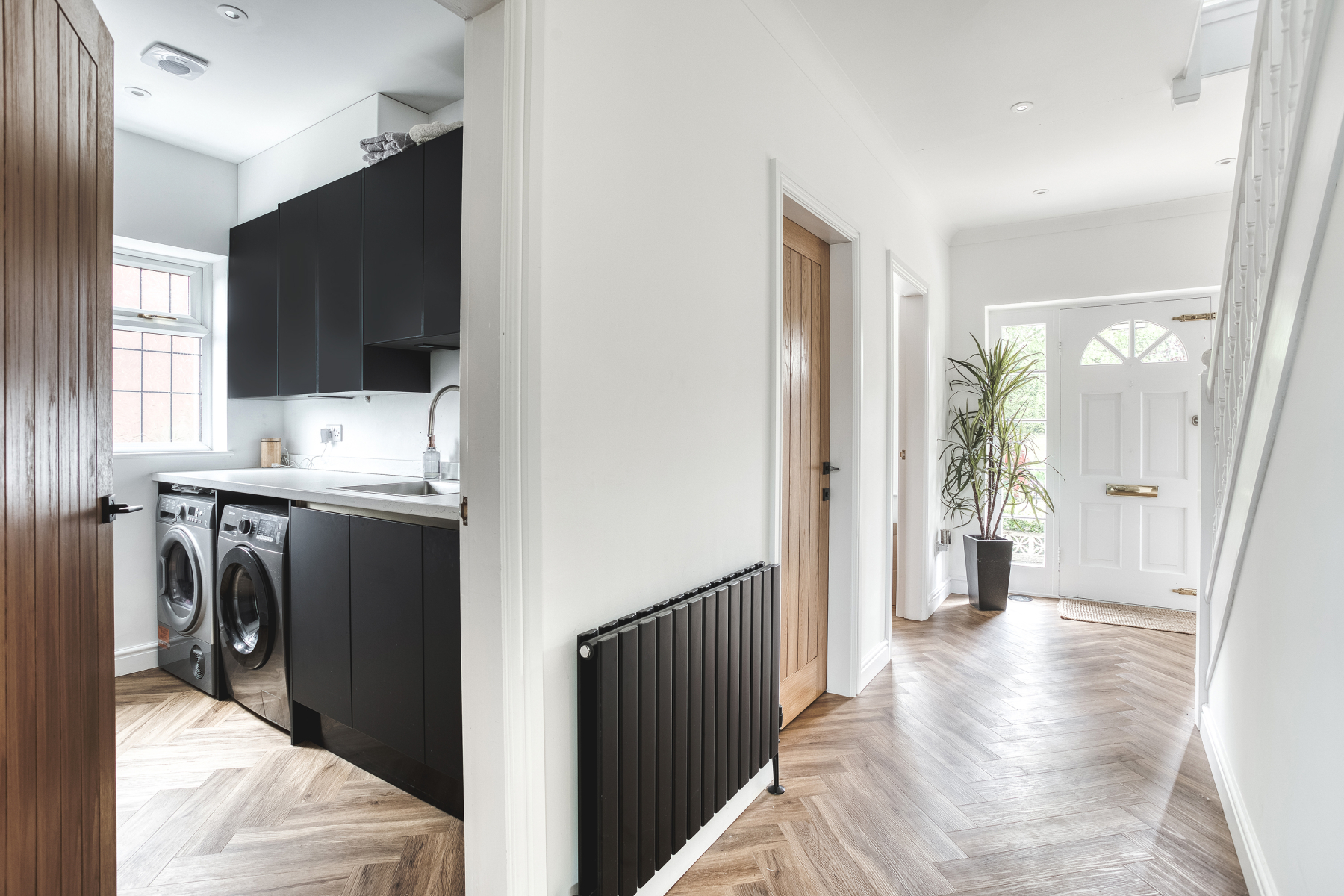 Entered via hardwood door with adjoining windows from the front elevation into this light and airy, spacious reception hall. Wall mounted feature radiator, carpeted staircase to 1st floor landing with under stairs storage cupboard and beautifully crafted LVT herringbone flooring.
