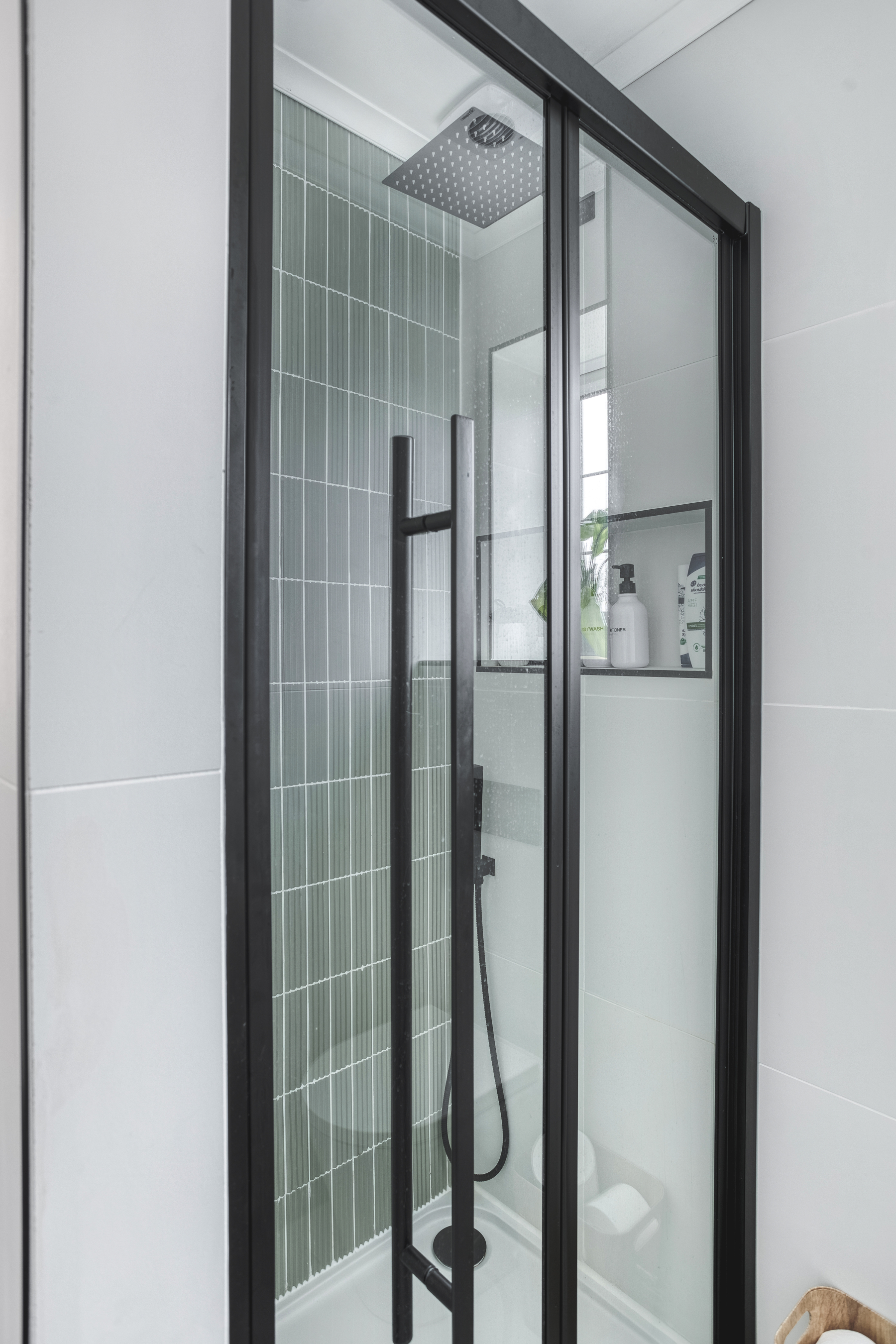 Again with the stylish LVT herringbone floor covering, encased WC and slimline vanity unit with inset sink with feature tiled splashback. Wall mounted black heated towel rail, feature floor to ceiling tiled wall, spotlights and extractor fan to ceiling.