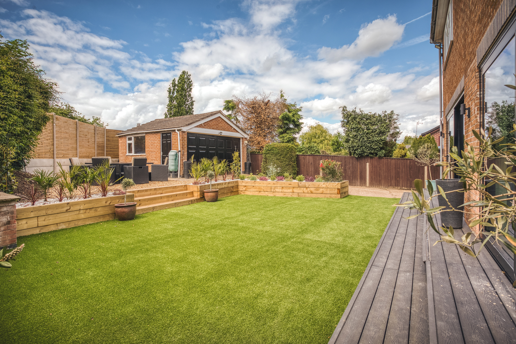 The extremely private rear garden benefits from an Astroturf lawn (Lazy Lawn) with raised sleeper borders, hedgerow boundaries and timber screening. A gravelled seating area and large double detached garage with up and over door light and power.