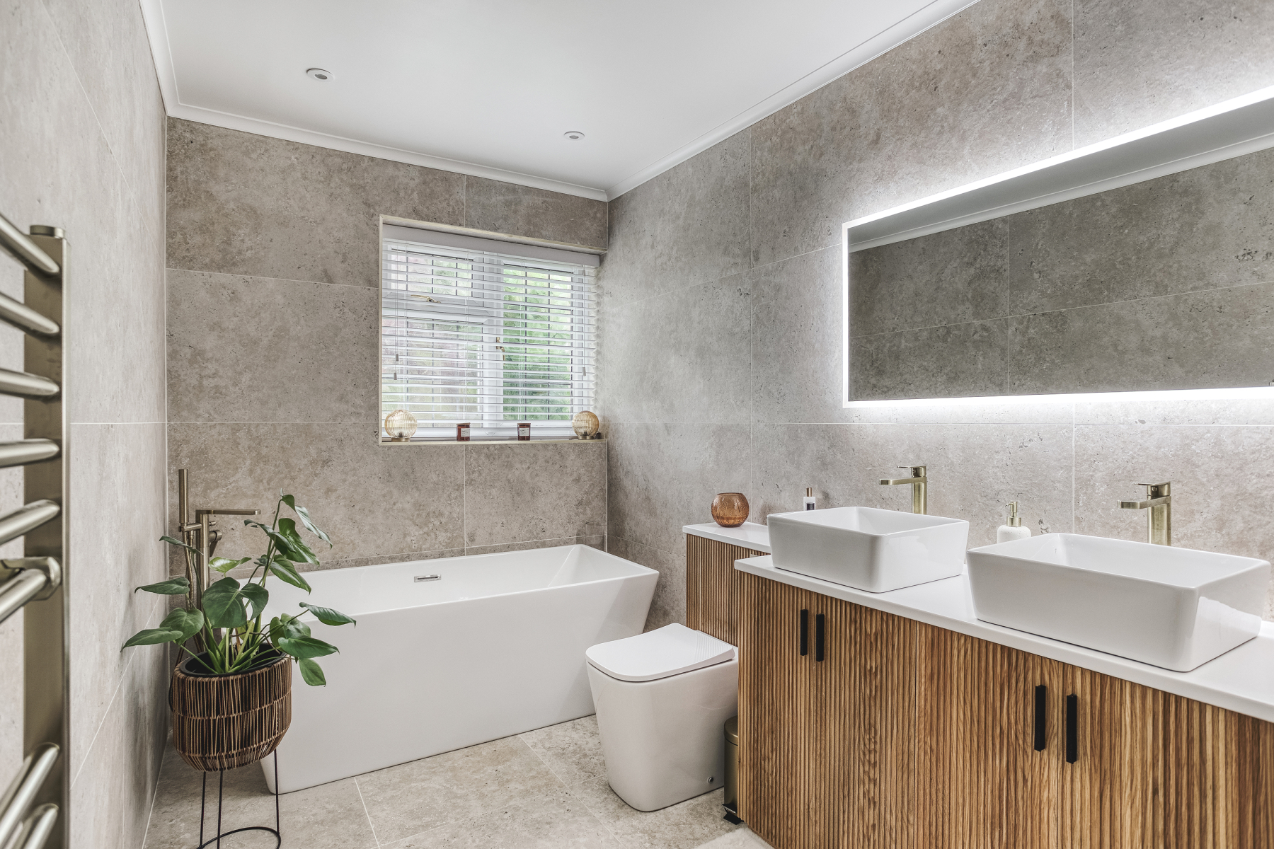 This spacious luxury bathroom suite comprises of an encased WC, large vanity unit with inset 'his and hers' sinks with beautiful brushed brass fittings. Modern bathtub with freestanding brush brass taps and shower attachment over.