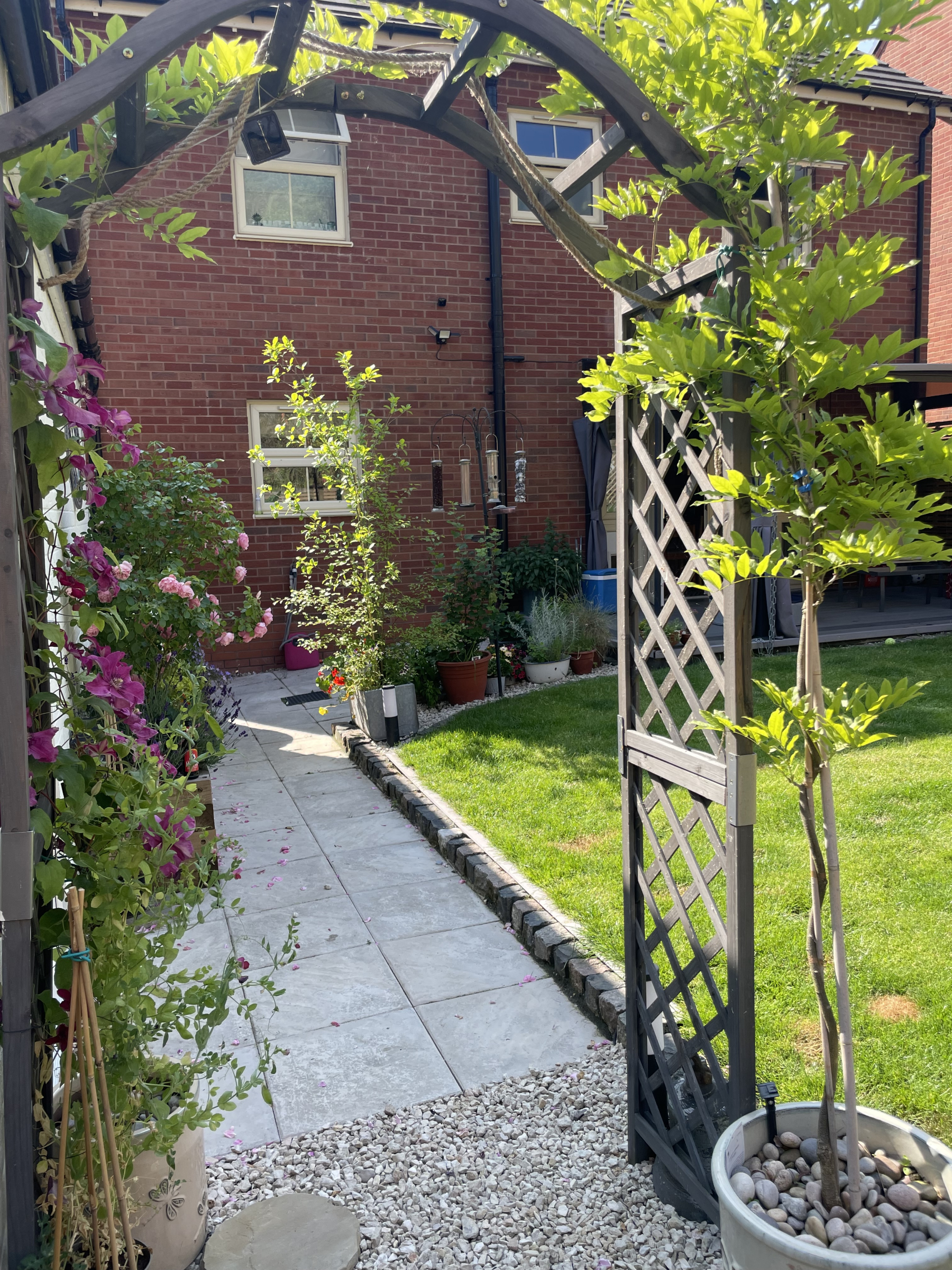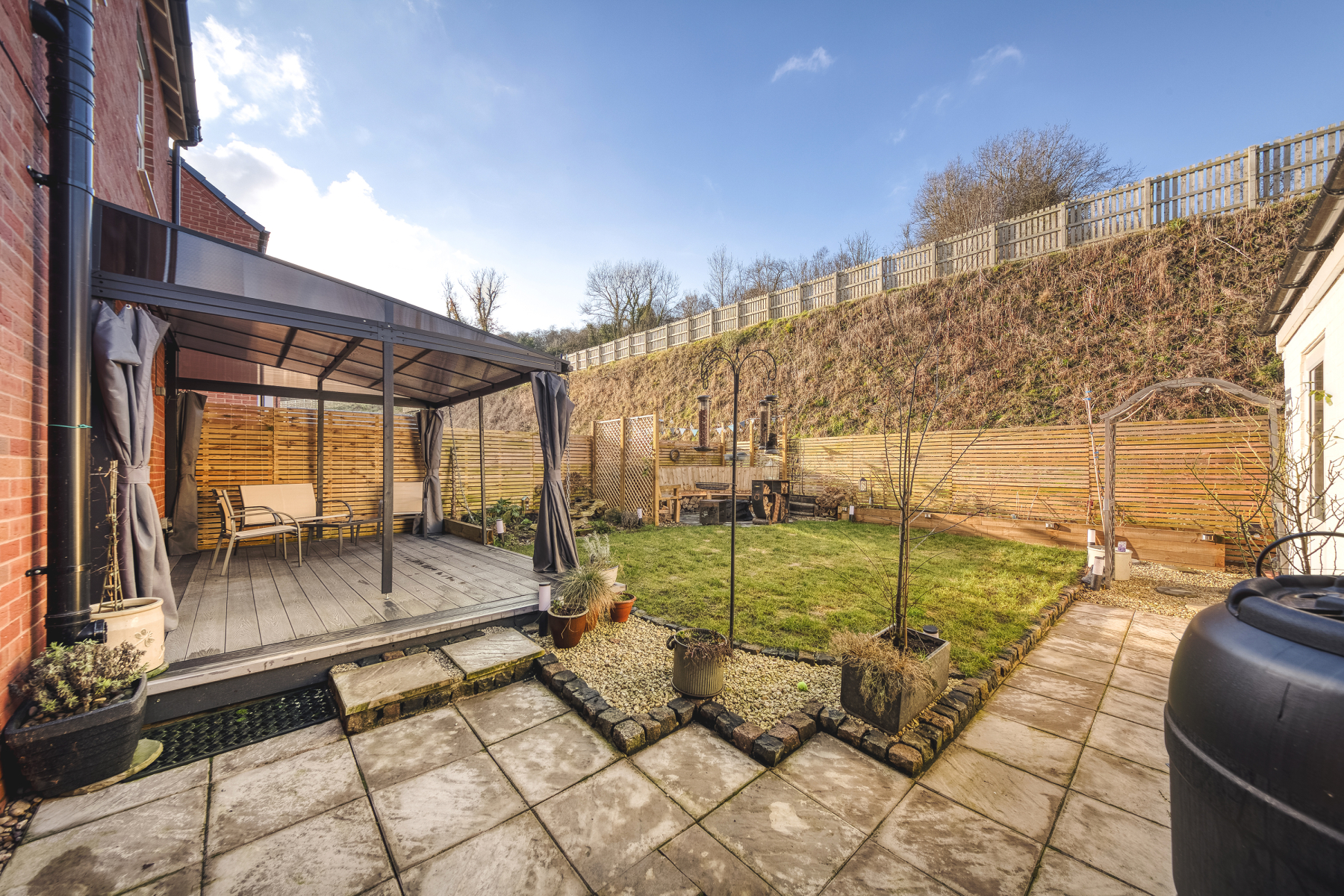 The superbly landscaped rear garden benefits from a entertaining deck and terrace with modern awning over. Paved pathways, raised sleeper planting beds with inset planting, lawn with raised stock borders and seated fencing and trellising. directly behind the garage is a useful potting and storage area and the focal point of the whole garden is a circular paved patio with bespoke curved seating, and external lighting.