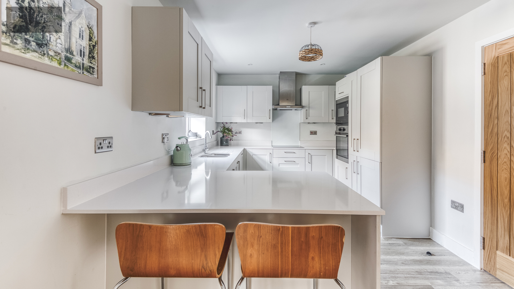 Kitchen area -comprising of a range of matching wall and base mounted units with quartz worksurface with inset moulded one and a half bowl stainless steel sink drainer. Under cupboard lighting, wood floor covering and a range of integrated appliances. Integrated appliances include AEG oven, microwave, fridge/freezer, induction hob with stainless steel extractor canopy and dishwasher. The kitchen worksurface blends effortlessly into a breakfast bar with seating space and provides a lovely focal point to the room.