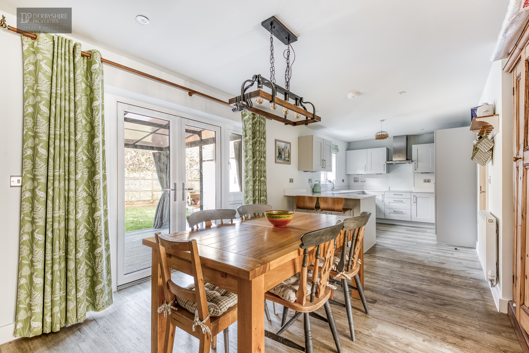 Dining area -with the continuation of the floor covering from the kitchen, wall mounted radiator, spotlighting and double glazed French doors with adjoining windows provide access to the rear garden.