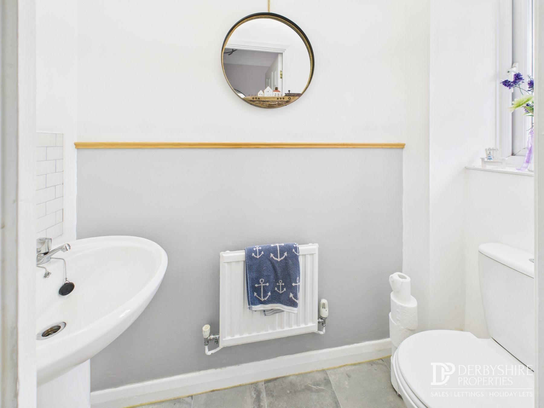Featuring low level WC and pedestal handwash basin with tiled splashback. Mini wall mounted radiator and double glazed obscured window to front elevation also feature.