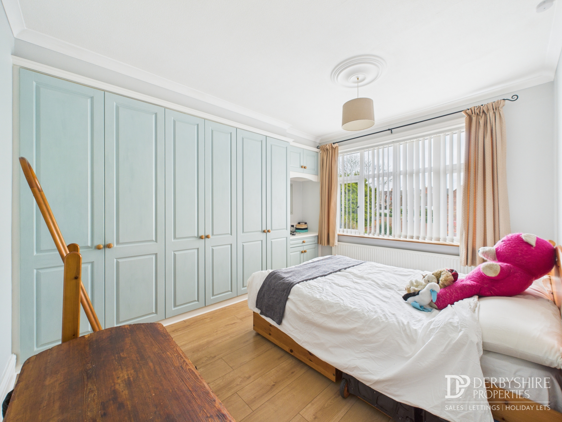 3.77m x 2.70m (12' 4" x 8' 10") With double glazed window to rear elevation, wall mounted radiator and wood effect flooring. Full length fitted wardrobes provide valuable storage/hanging capacity whilst fitted desk forms the ideal dressing area.