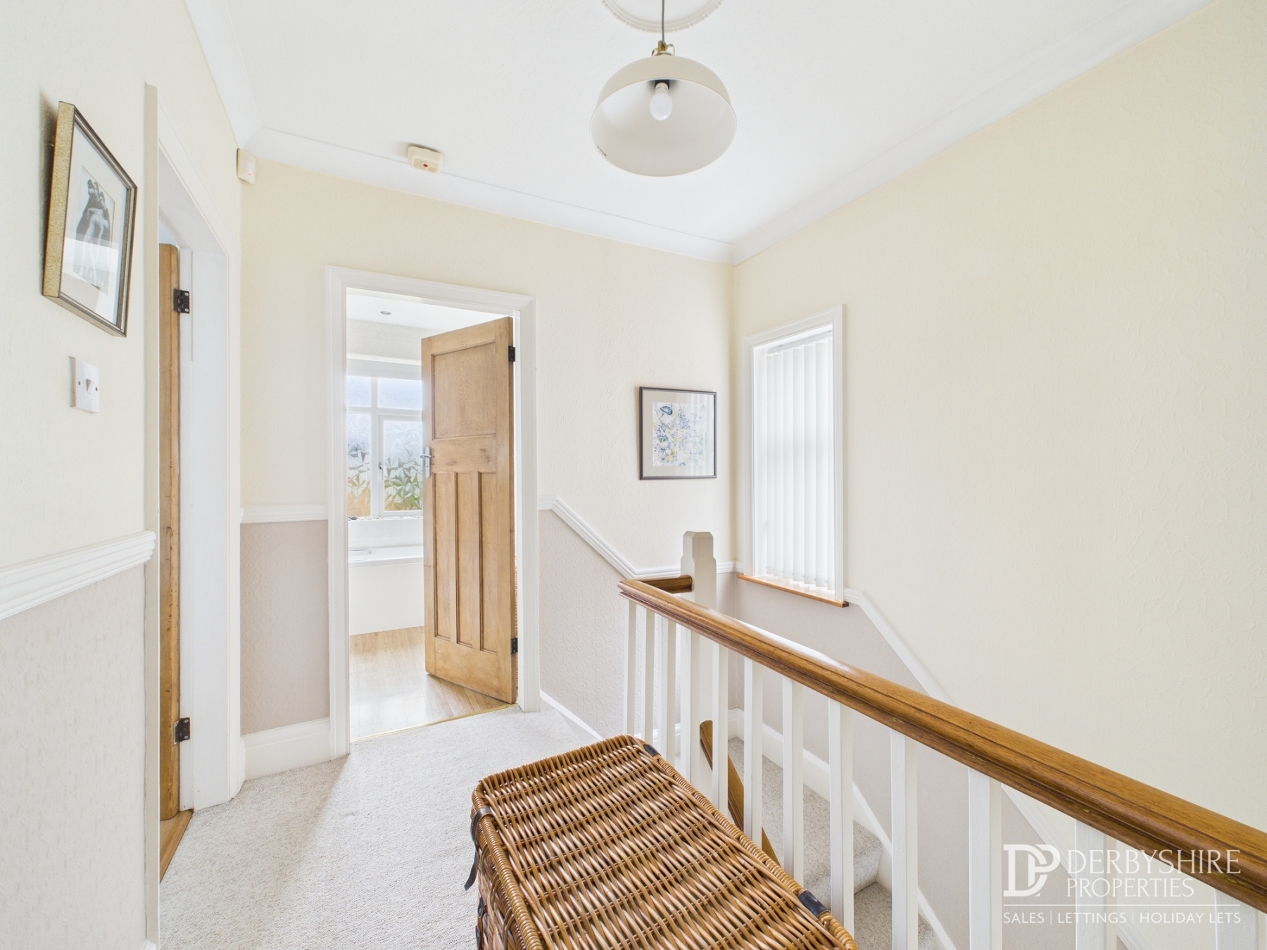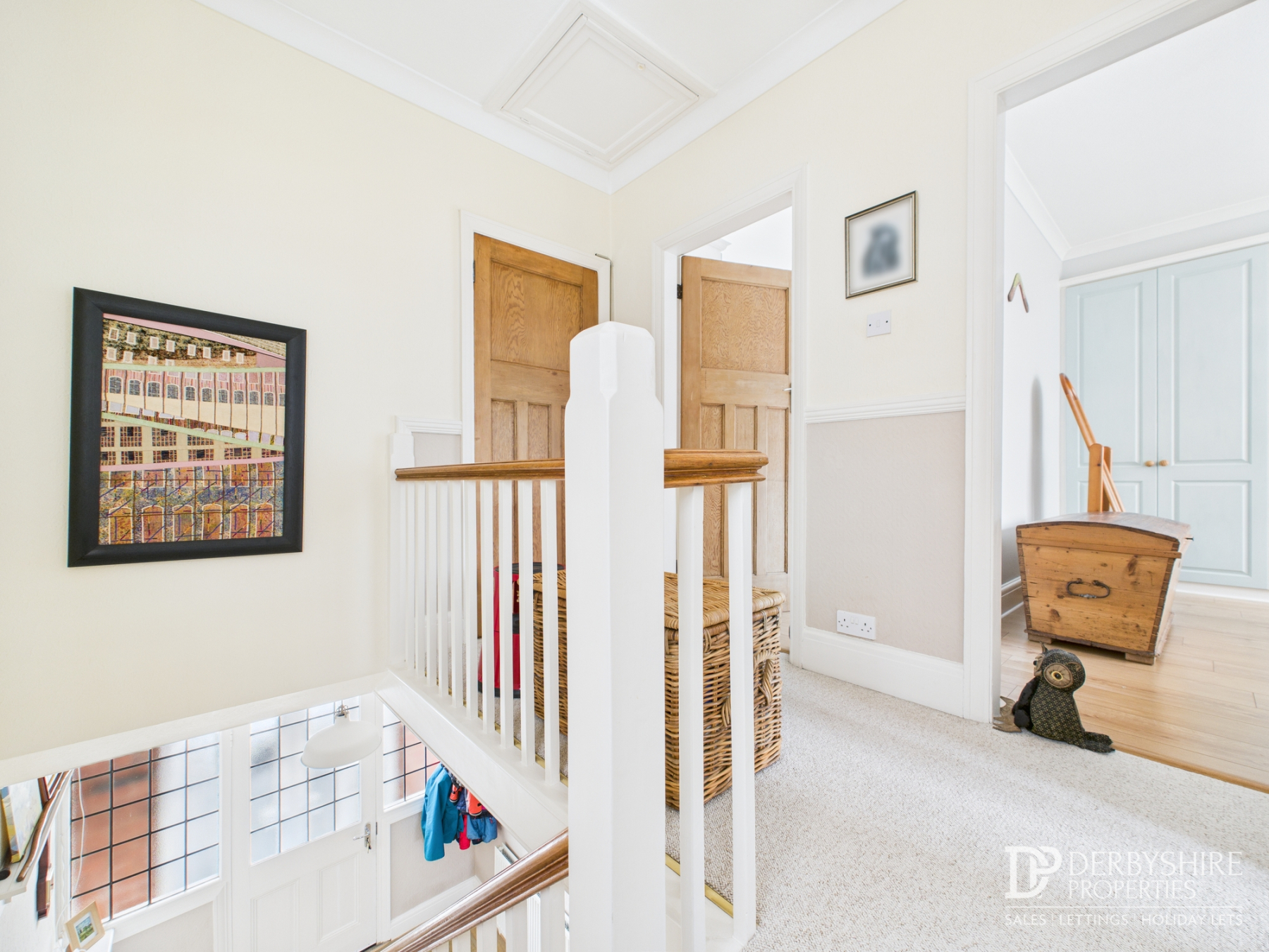 Fabulous landing area benefitting from double glazed window to side elevation, oak banister and loft hatch access. Doorways to;