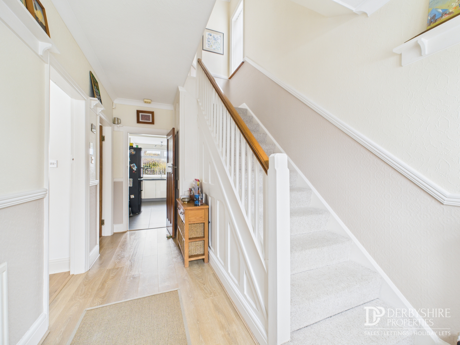 With dual UPVC double glazed doors accessing entrance porch housing traditional front doorway with obscured glass and timber surround. Wood effect flooring runs throughout whilst wall mounted radiator and carpeted stairs rising to the first floor also feature. Doorways to;