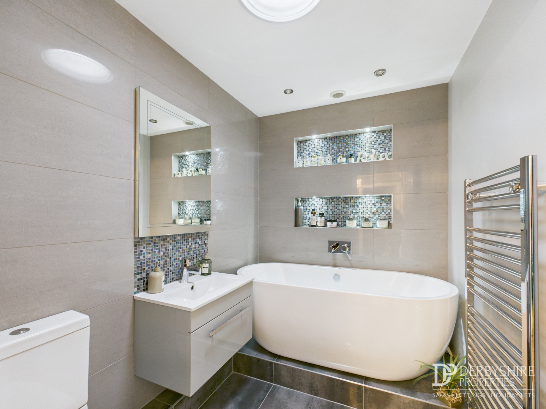 The main bathroom is beautifully appointed with a three-piece suite comprising a WC, wall-mounted wash hand basin with tiled splashback, and a large bathtub with centrally mounted taps and a display alcove. The space is finished with tiled flooring, a wall-mounted chrome heated towel rail, recessed spotlights, a double-glazed light tunnel to the ceiling, and a ceiling extractor fan.