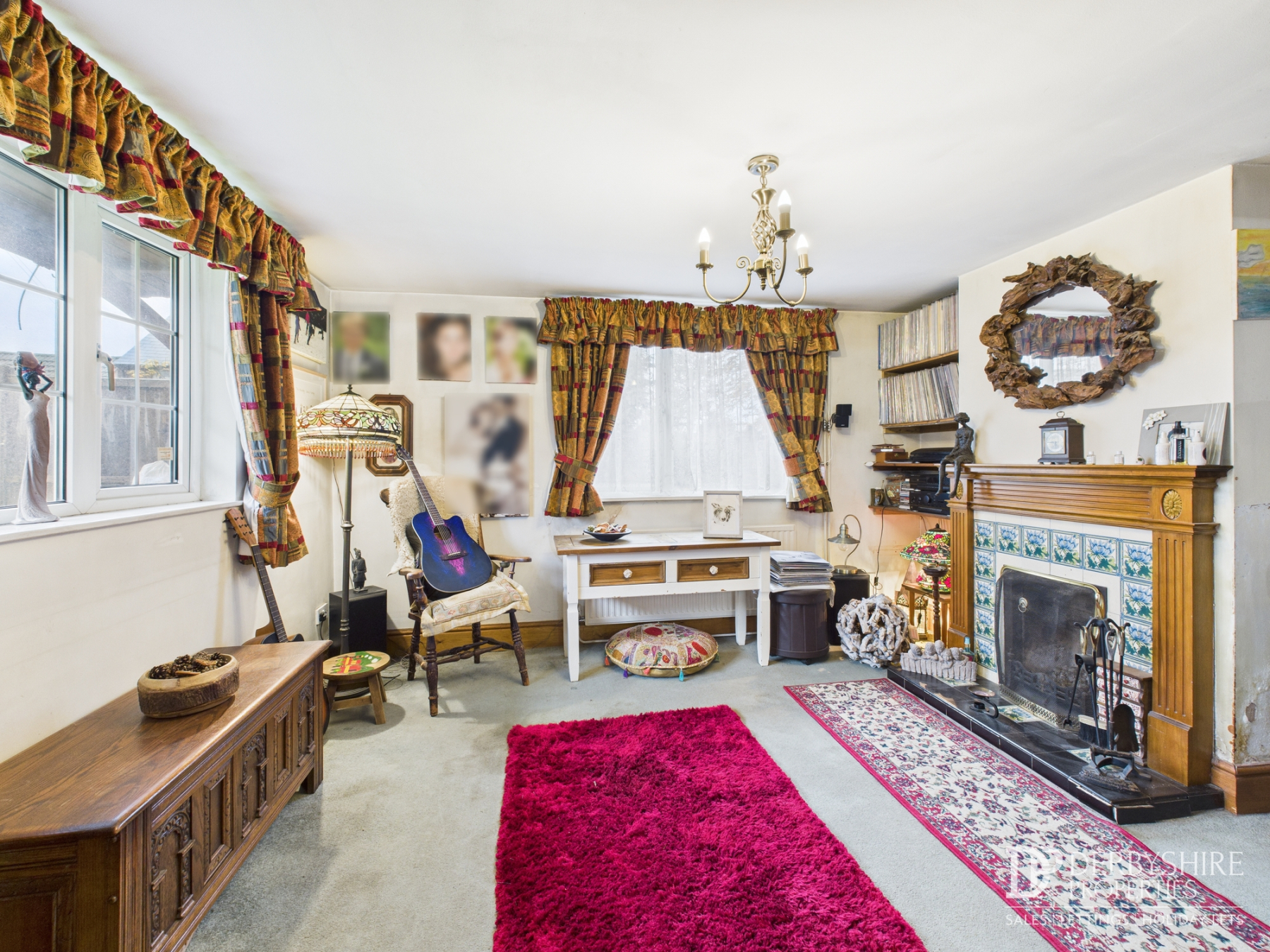 Dining Area – With double-glazed windows to both the front and side elevations, shelving fitted within the chimney recess, and an open fireplace with decorative wooden surround, tiled backdrop, and raised tiled hearth — offering a perfect setting for family dining or entertaining.