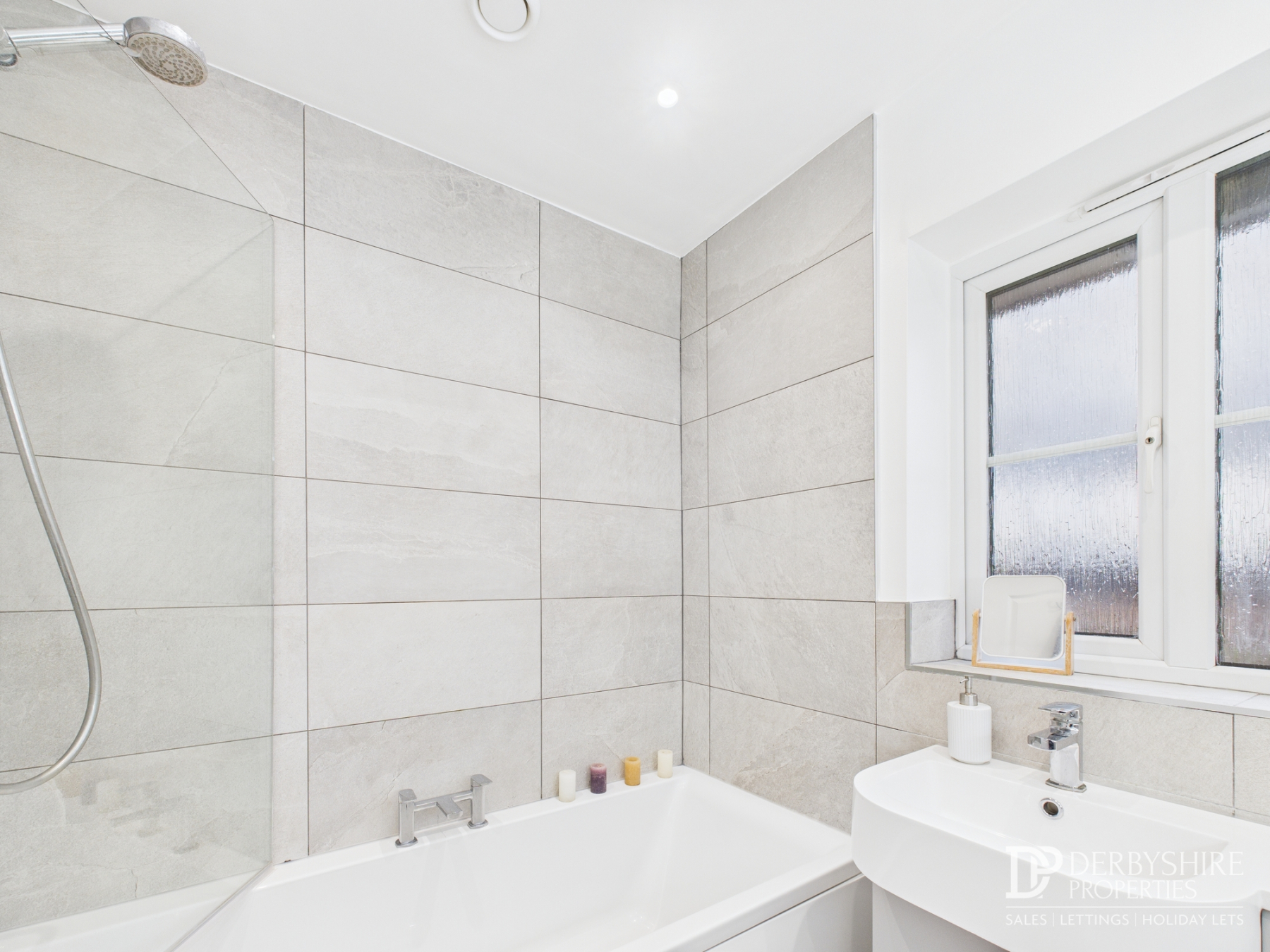 Fitted with a modern three-piece white suite comprising a WC with vanity unit and a panelled bath with mains-fed shower over and glass shower screen. Complemented by part-tiled walls, wood-effect flooring, obscured double-glazed window, vertical heated towel rail, shaver point, ceiling spotlights and extractor fan.