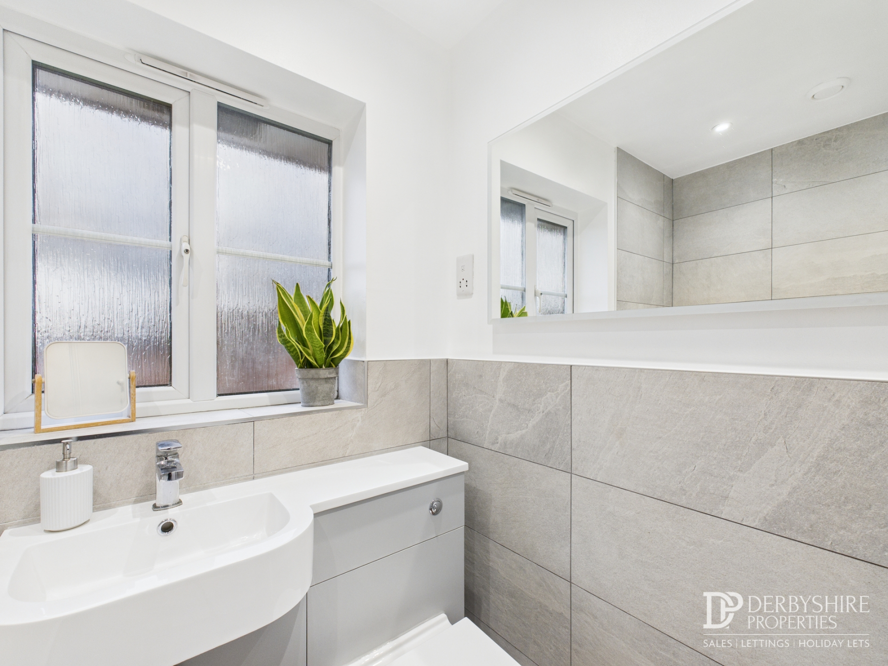 Fitted with a low-level WC and wall-mounted wash hand basin with tiled splashback. Double-glazed obscured window to the front elevation.