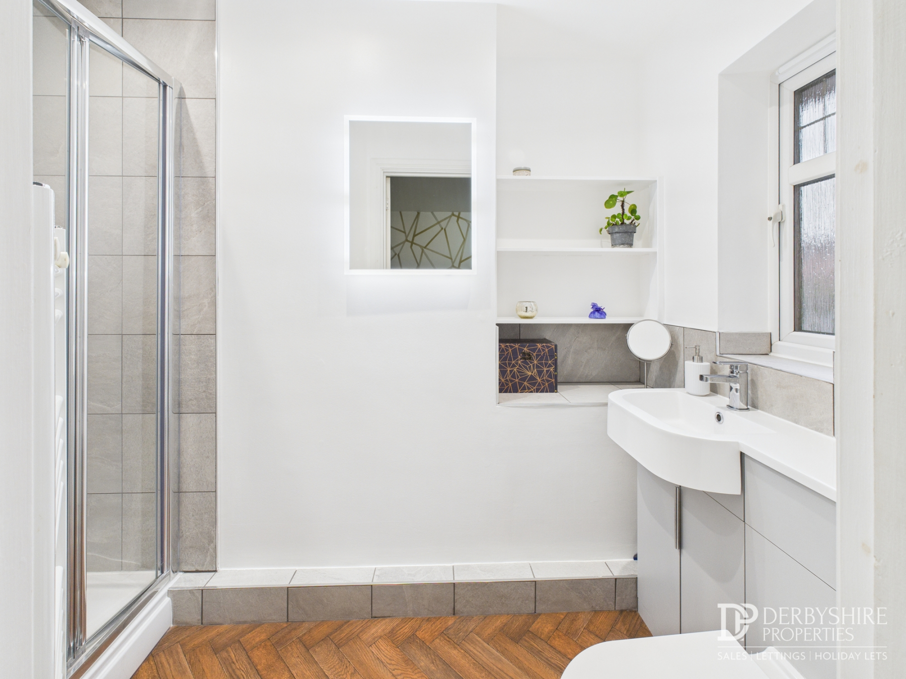 A modern three-piece suite comprising an encased WC with vanity unit and a large shower enclosure with mains-fed shower. Finished with parquet-style flooring, obscured double-glazed window, spotlights and extractor fan.