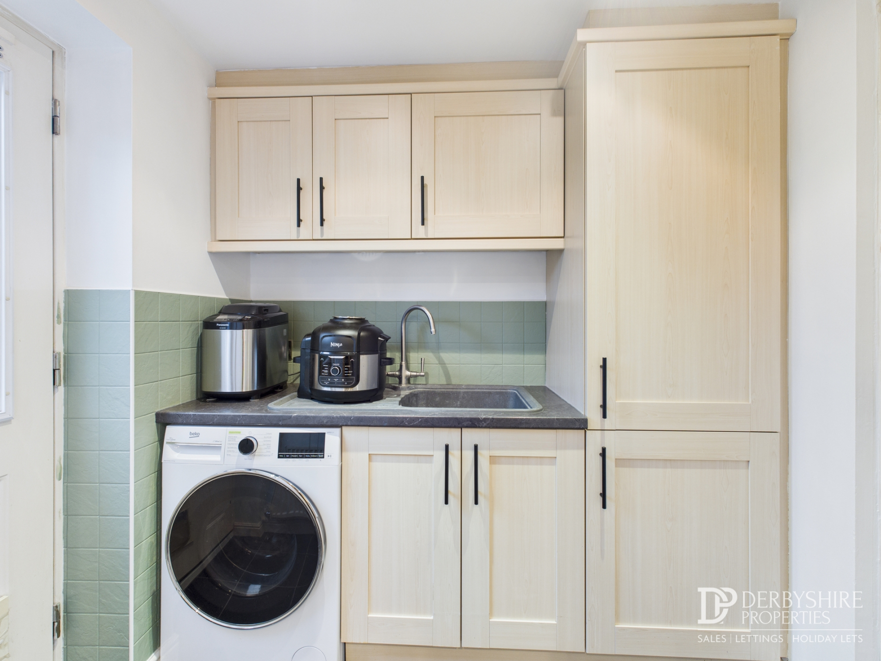 Continuing the tiled flooring and fitted units from the kitchen, incorporating a single bowl sink with mixer tap. There is plumbing and space for a washing machine, wall-mounted radiator, a door leading to the rear garden and internal access to the integral garage.