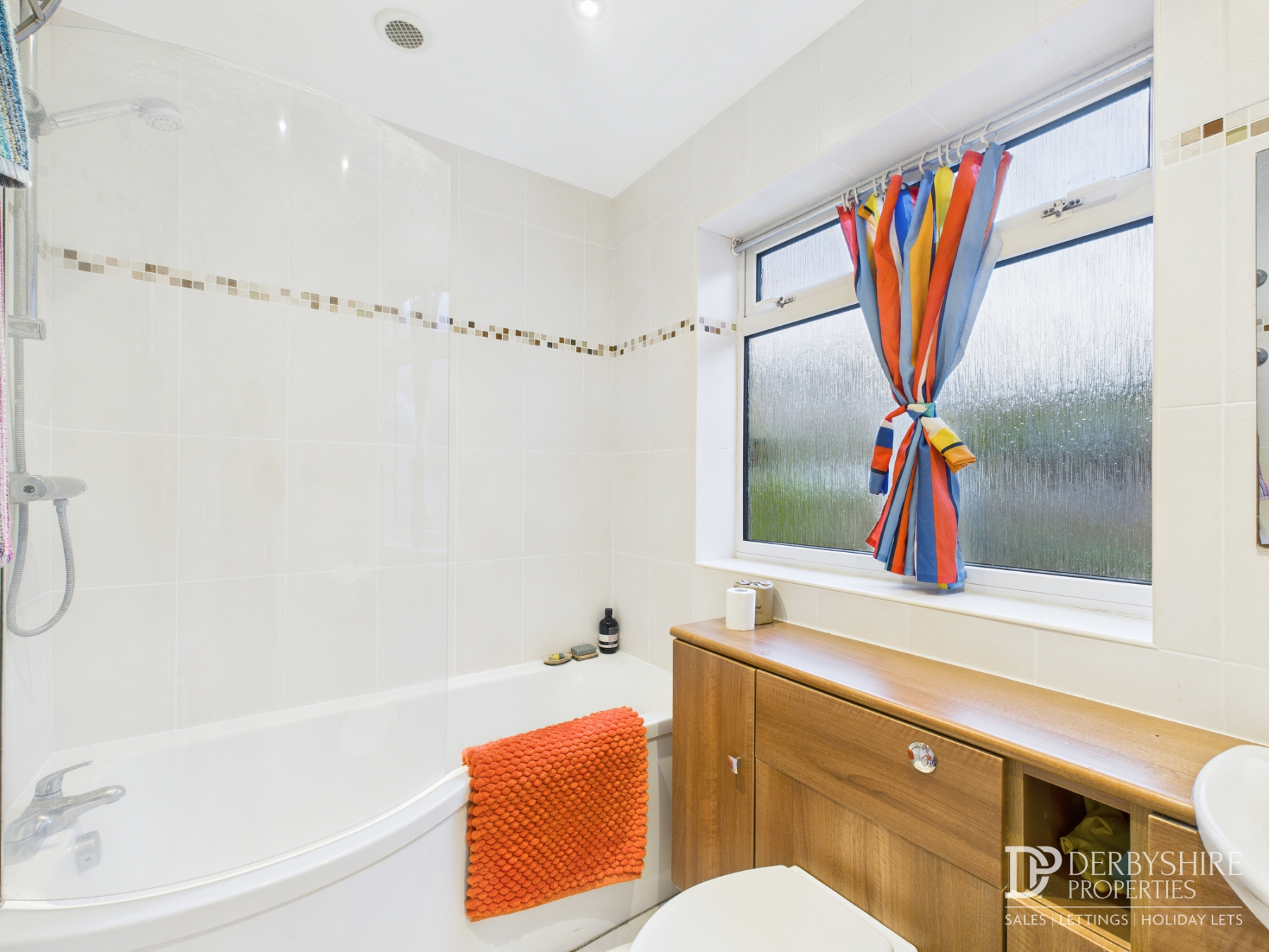 The first floor comprises a modern three-piece bathroom fitted with an encased WC, vanity unit with inset wash hand basin, and a space-saving bath with mains-fed shower and glazed screen. The room is finished with fully tiled walls and flooring, ceiling spotlights and an obscured double-glazed window.