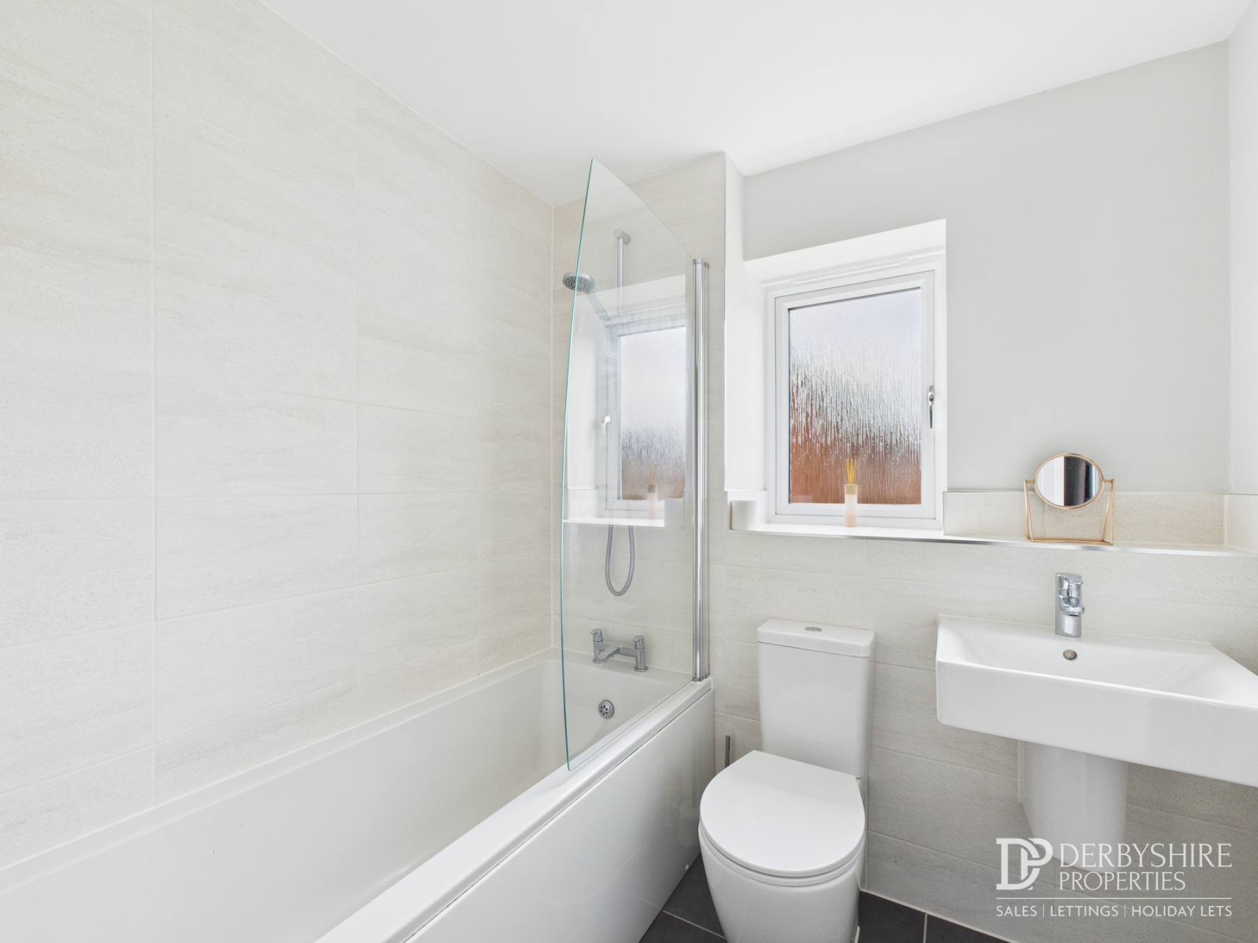 The family bathroom features an obscured window, part-tiled walls, and a tiled floor. It is fitted with a wall-mounted hand wash basin, WC, and a bath with a glass shower screen and overhead shower, complemented by a chrome radiator.