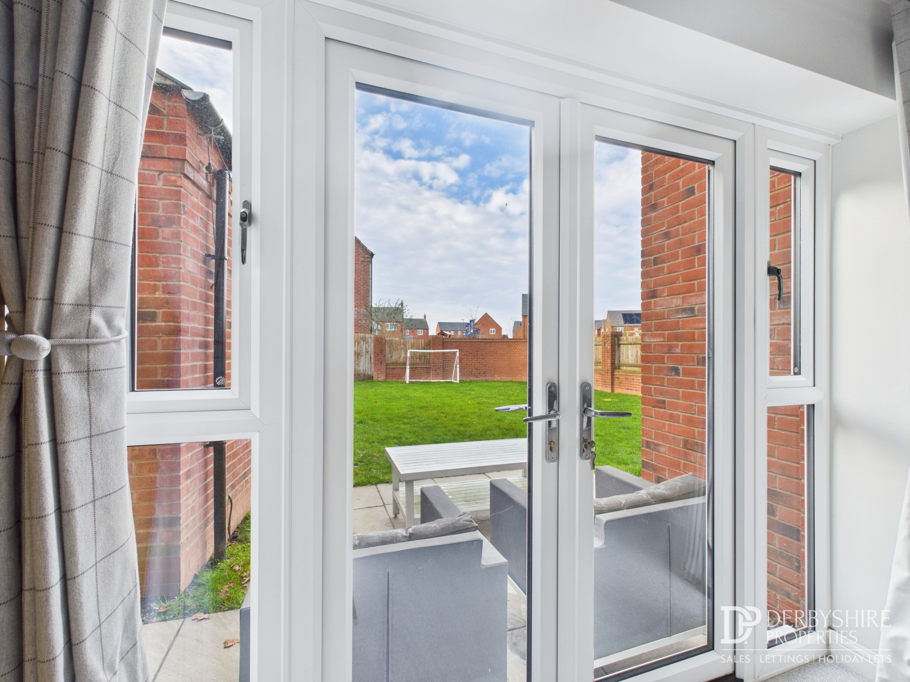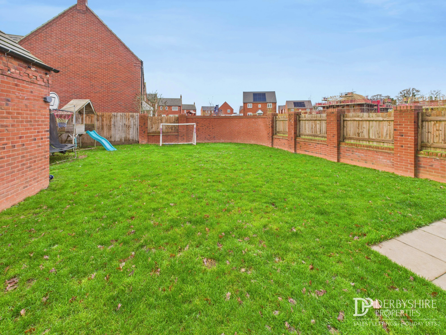 The rear garden is fully enclosed and mostly laid to lawn, complemented by a brick wall with feature fencing and a paved patio area, creating an ideal space for outdoor entertaining and family enjoyment.