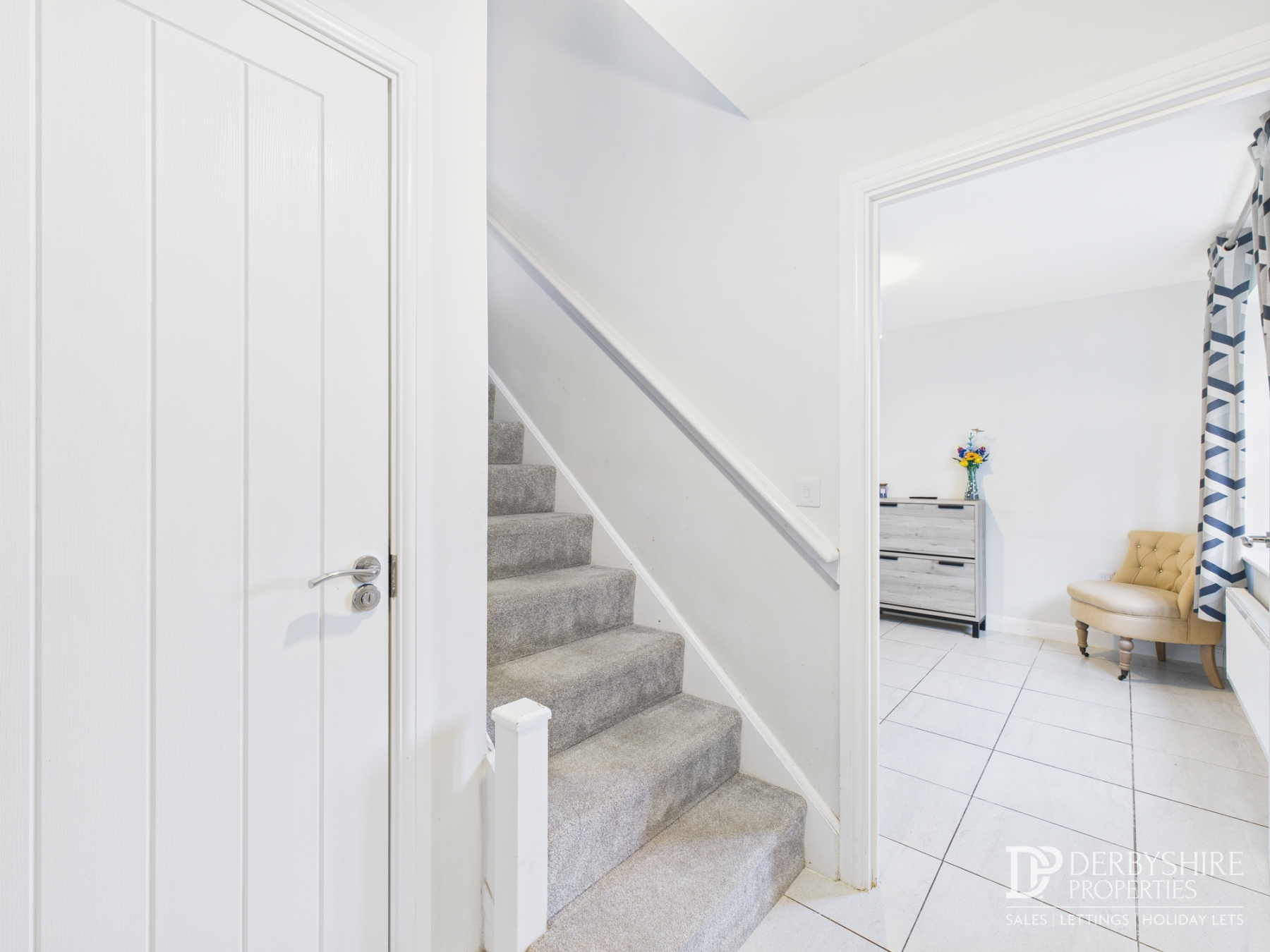 The property is entered via a welcoming entrance hallway with tiled flooring throughout, offering immediate access to the living room, the open-plan kitchen and dining area, a guest WC/cloakroom, and the staircase rising to the first floor.