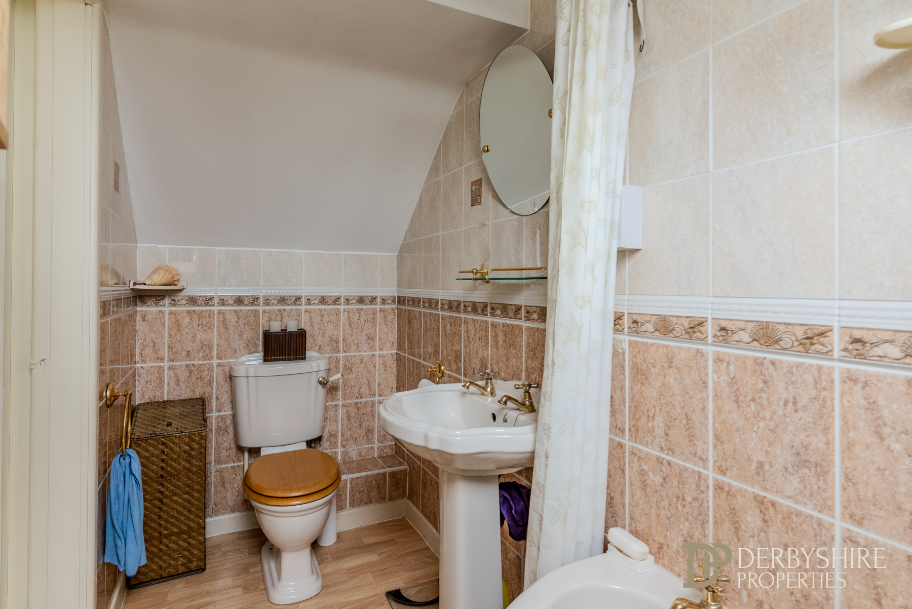 Comprising a three-piece suite including WC, pedestal wash hand basin and corner spa bath with wall-mounted electric shower and attachment. Fully tiled walls, vinyl floor covering, obscured Velux window and wall-mounted radiator.