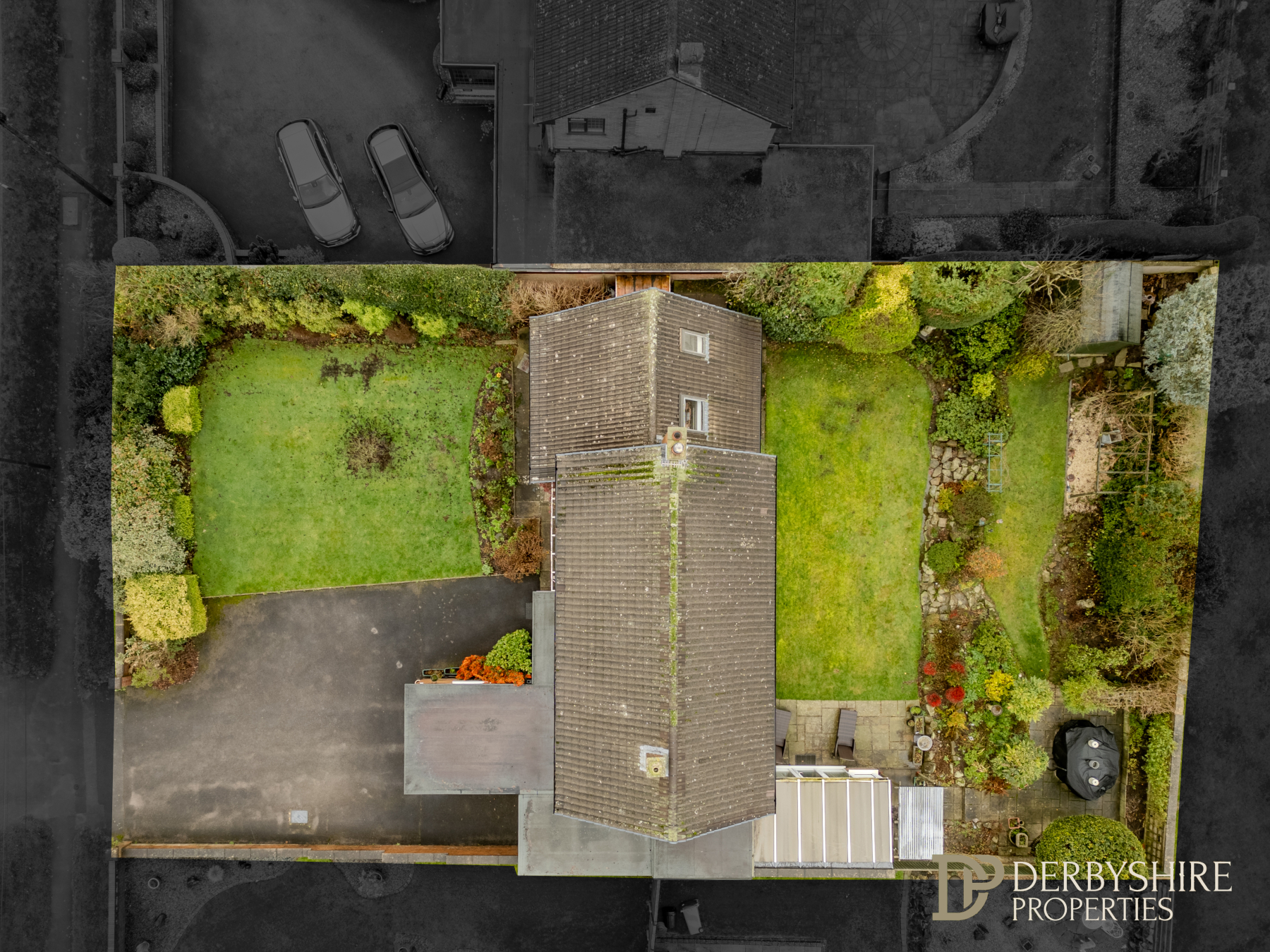 The property occupies a superb, well-proportioned plot that has matured beautifully over time. To the front elevation, a large turning driveway provides parking for multiple vehicles, along with a carport and garage.