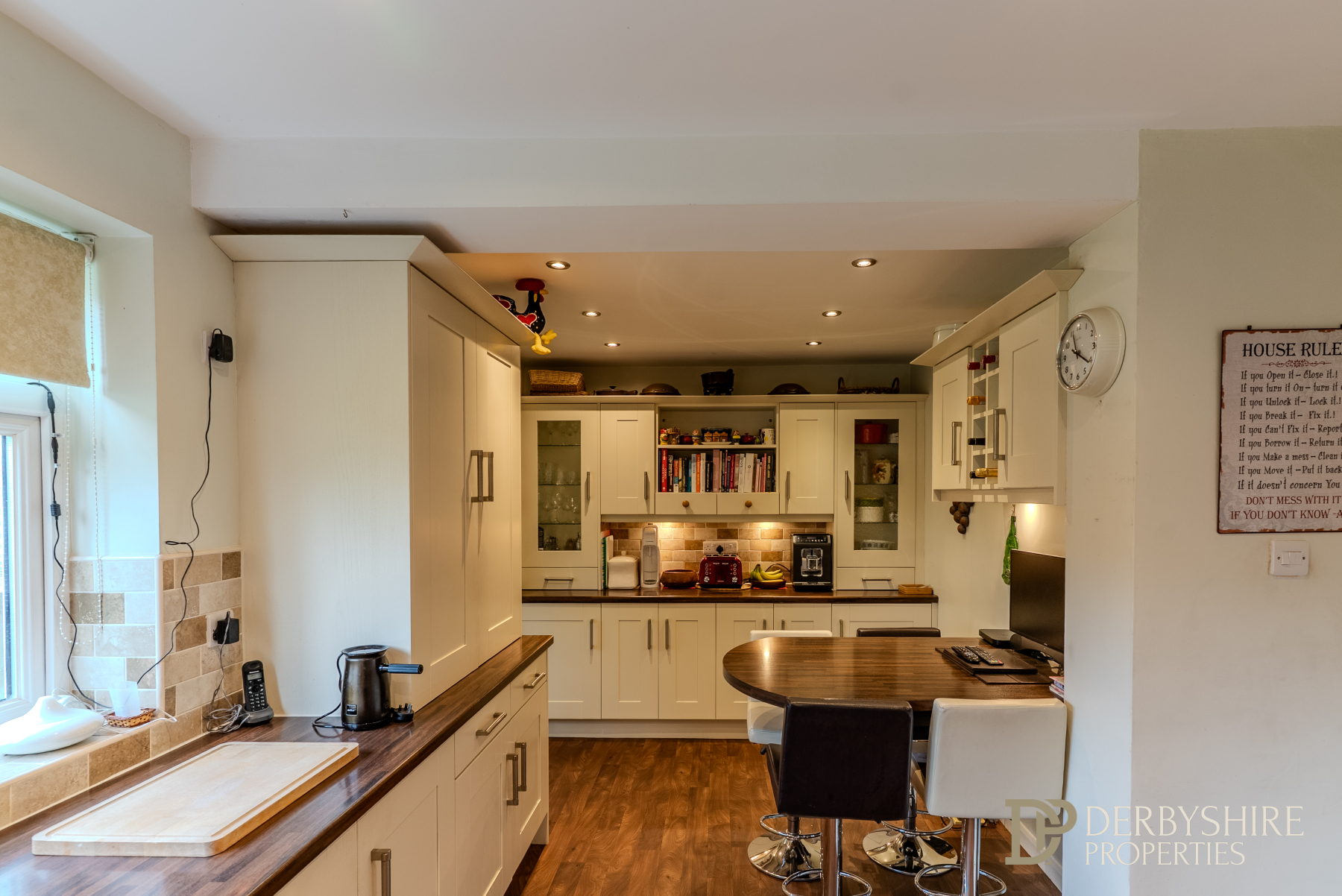 A modern and well-appointed breakfast kitchen fitted with a comprehensive range of wall and base units with roll-top work surfaces, incorporating a 1½ bowl sink with mixer tap and tiled splashbacks. Integrated appliances include a dishwasher, five-ring gas hob with stainless-steel extractor canopy, AEG fan-assisted electric oven, AEG microwave, fridge and freezer. Finished with Karndean wood-effect flooring, under-unit lighting, ceiling spotlights and a double-glazed window to the rear elevation. A central breakfast bar provides seating for four people. An internal door leads to: