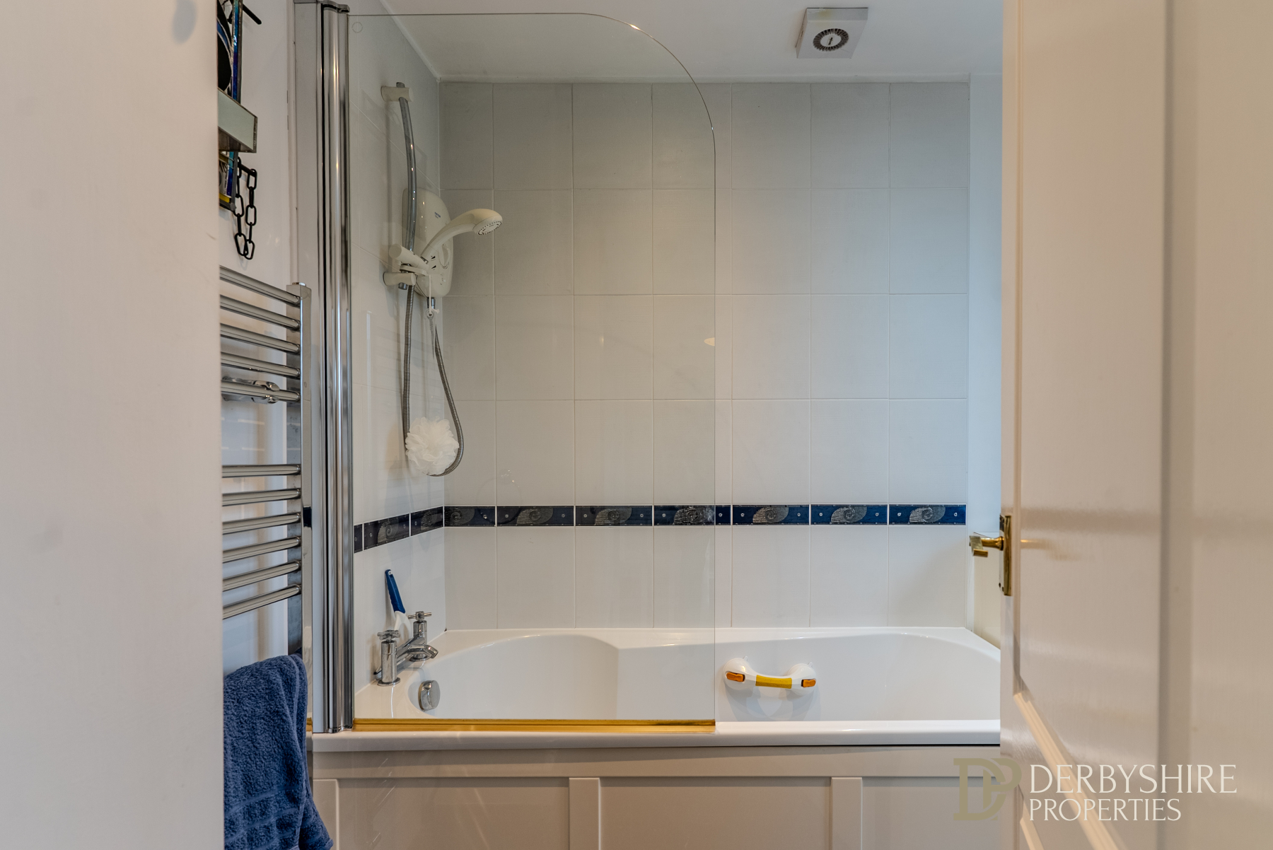 Comprising a three-piece suite including an encased WC, vanity unit with storage, panelled bath with electric shower and glass shower screen. Part-tiled walls, obscured double-glazed window, chrome heated towel rail, vinyl flooring, ceiling spotlights and extractor fan.