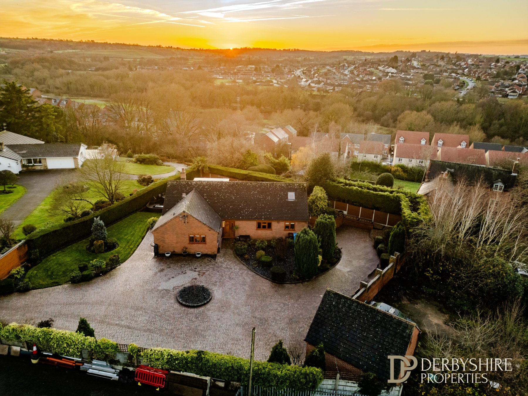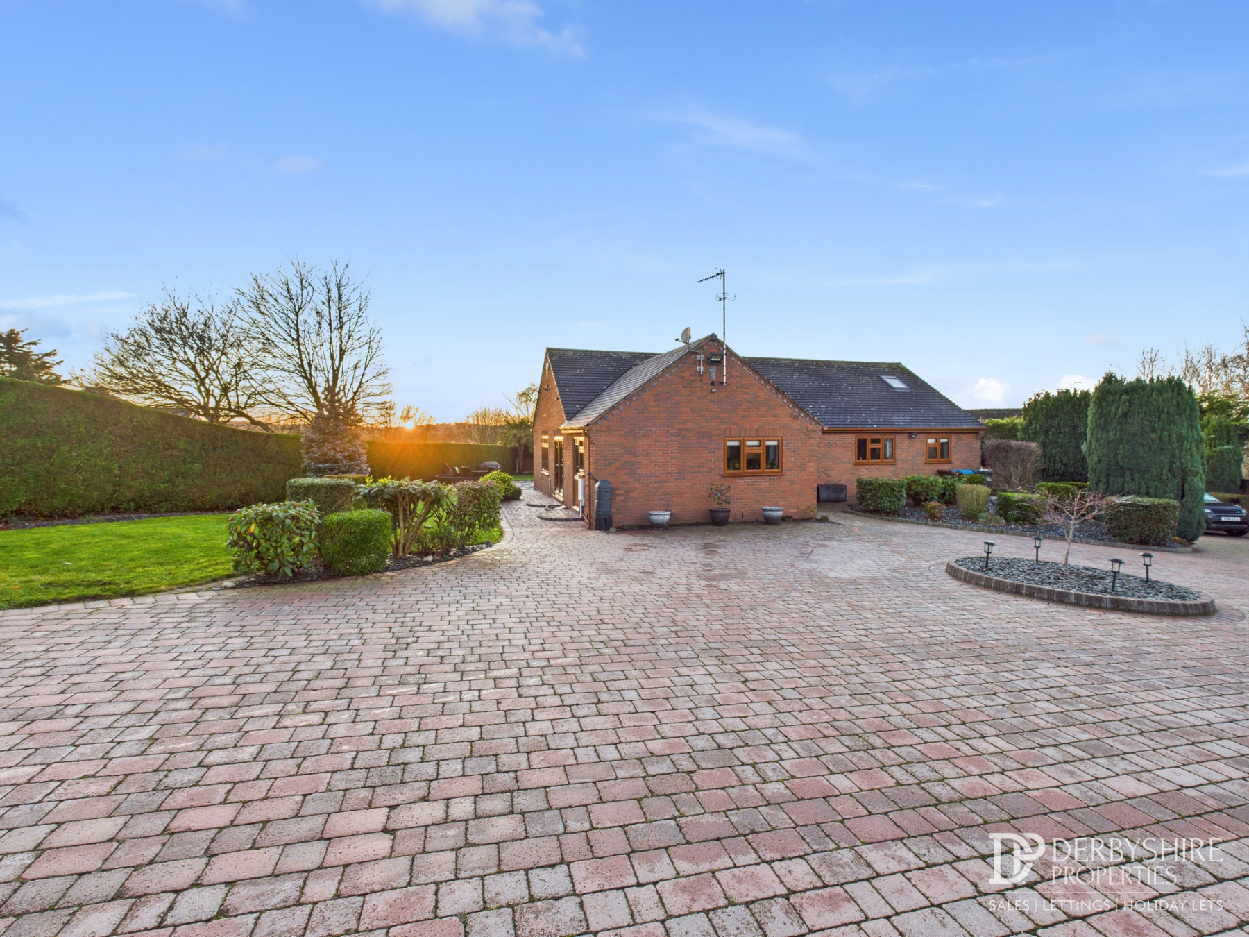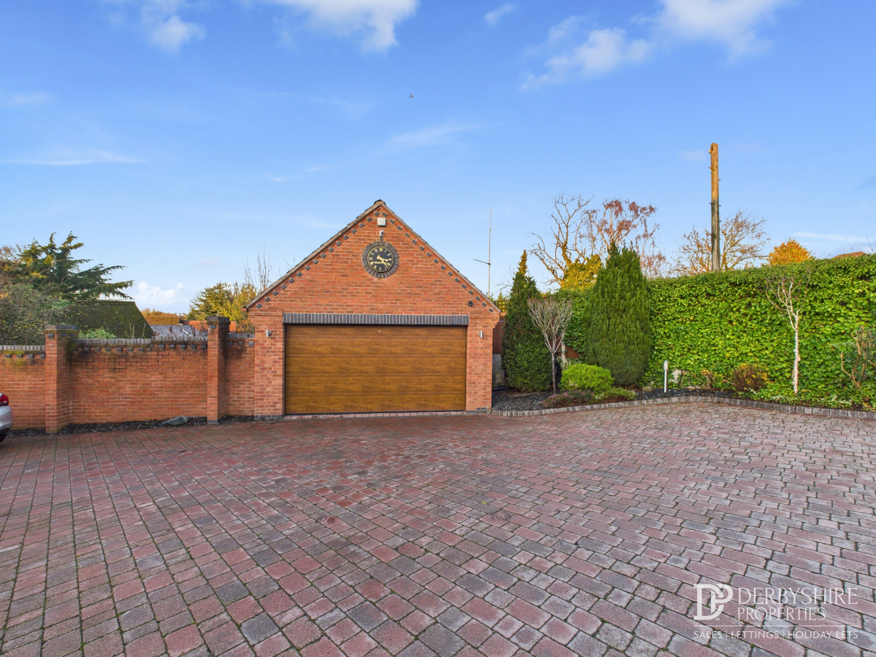 The property is approached via a private driveway, owned by the property, serving just two residences. Electric privacy gates open onto an expansive block‑paved driveway providing parking and turning for in excess of 20 vehicles, along with space for a caravan or boat. A detached brick‑built double garage provides further storage or parking.