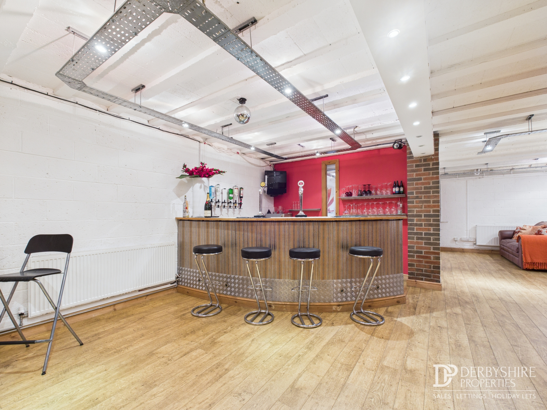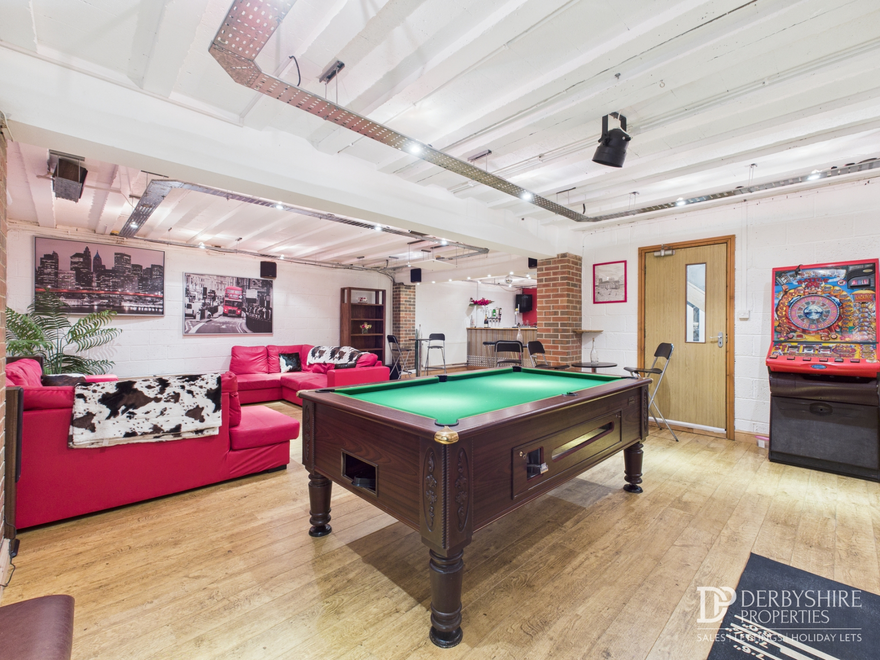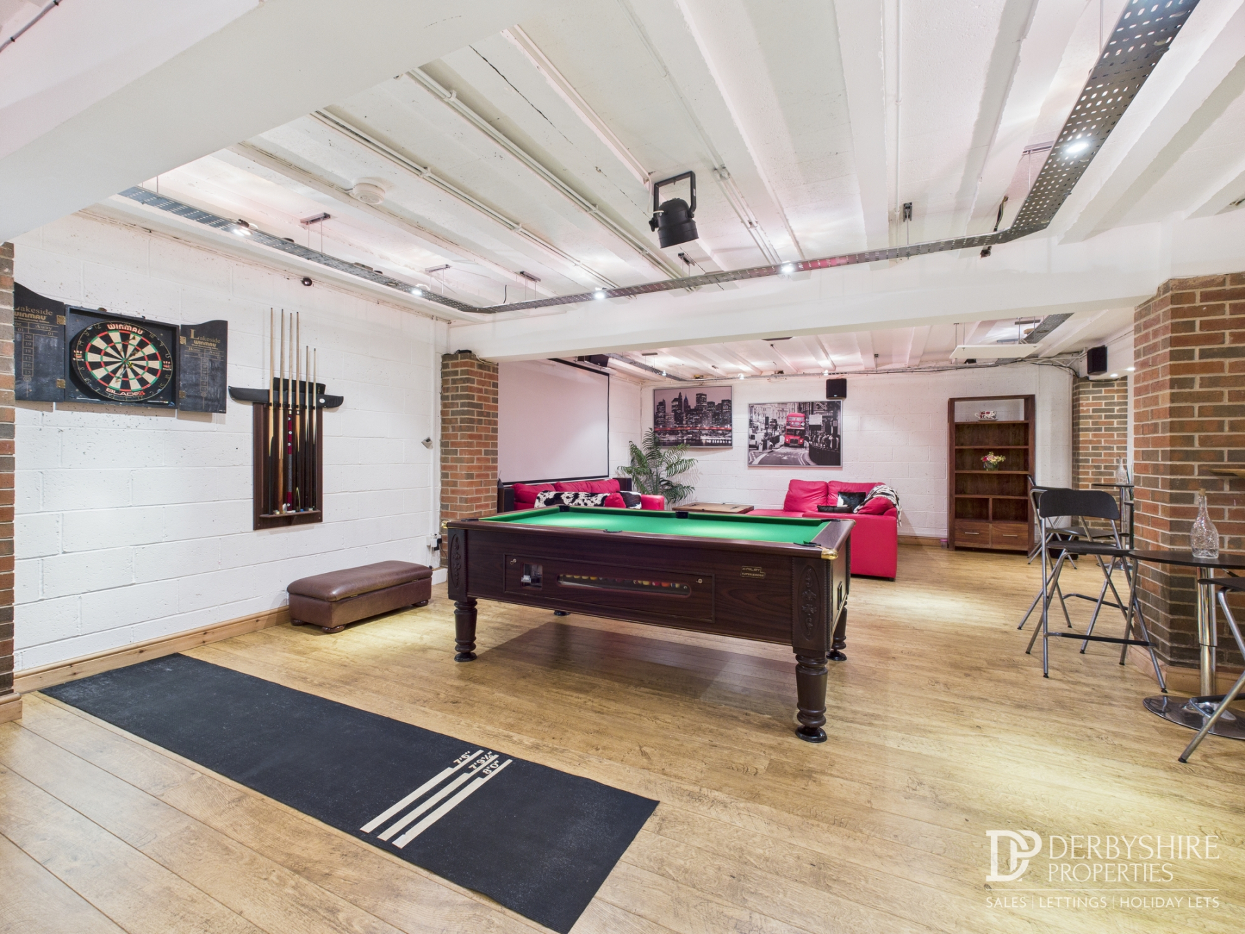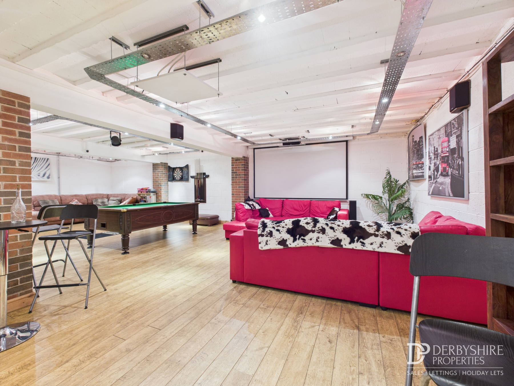 Bar / Games Room: A superb open‑plan L‑shaped room featuring wood flooring, ceiling spotlights, space for a pool table and darts area, two generous seating zones, cinema screen and projector, and a substantial bar area with integrated speaker system. Ideal for entertaining or social gatherings.