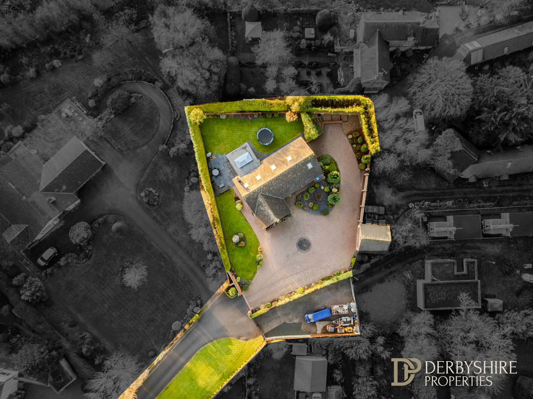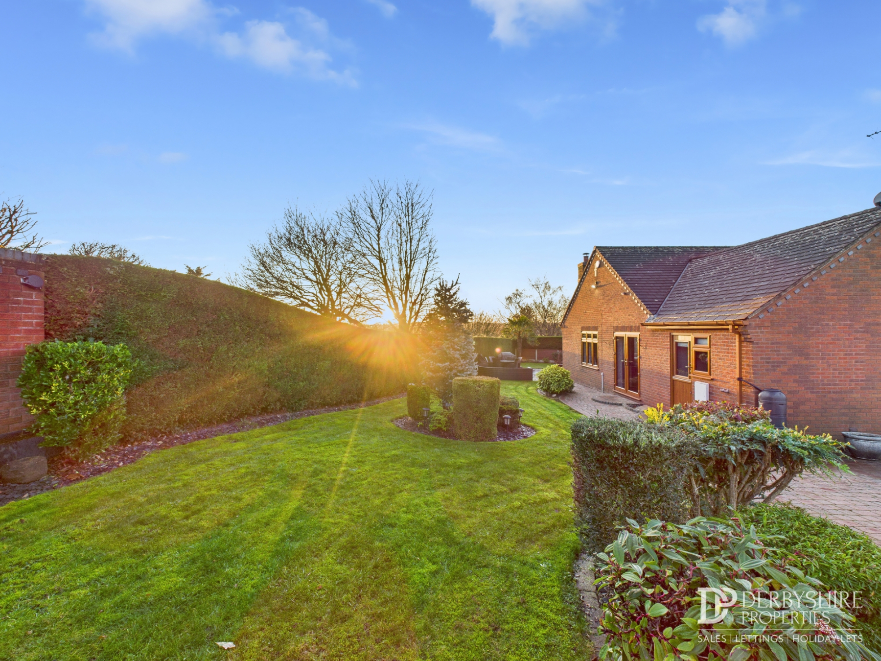 The professionally landscaped gardens surround the property and offer a high degree of privacy, with lawns, well‑stocked flower beds and borders, outdoor lighting, external water supply, and an extensive patio terrace ideal for outdoor entertaining.