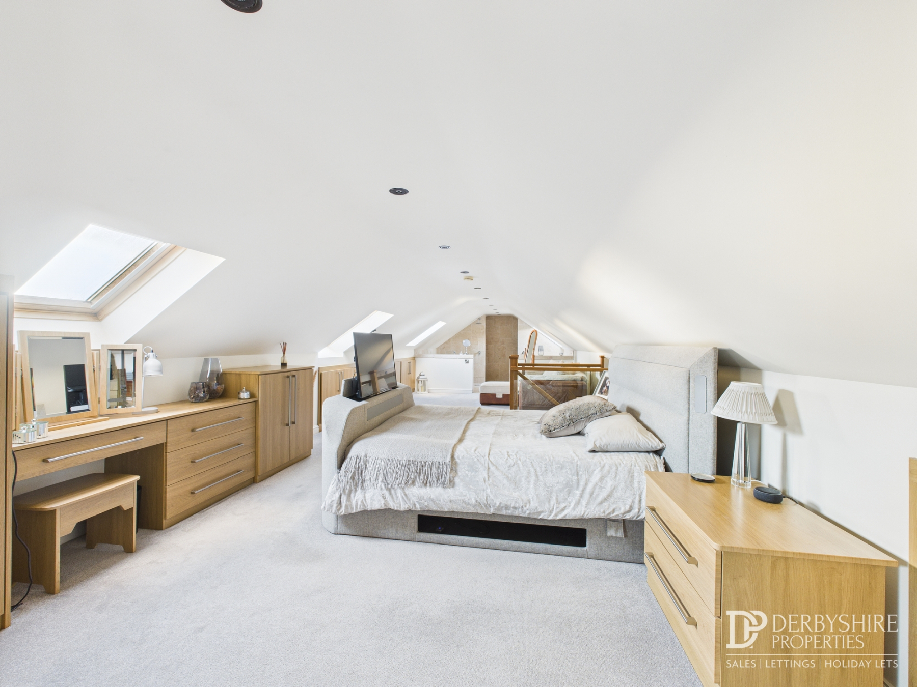 Spanning the full width of the property, this outstanding bedroom suite is located within the roof space and offers an exceptional sense of space. The open‑plan layout provides clearly defined areas for sleeping, dressing and relaxation, complemented by extensive fitted furniture including wardrobes, dressing tables and bedside units.