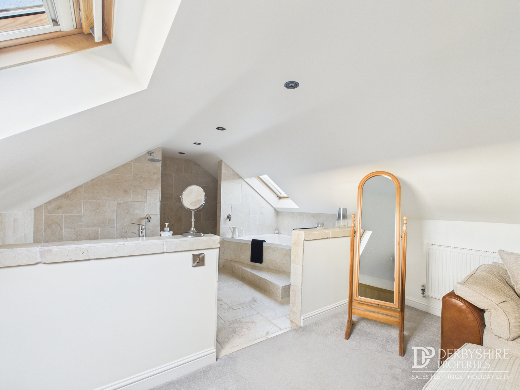 Luxury En‑Suite Bathroom: Featuring a large walk‑in shower with rainfall head and central drain, raised bath with inset taps, WC, vanity unit with inset basin, linen storage cupboard, heated towel rail, Velux roof window, and full tiling to walls and floors.