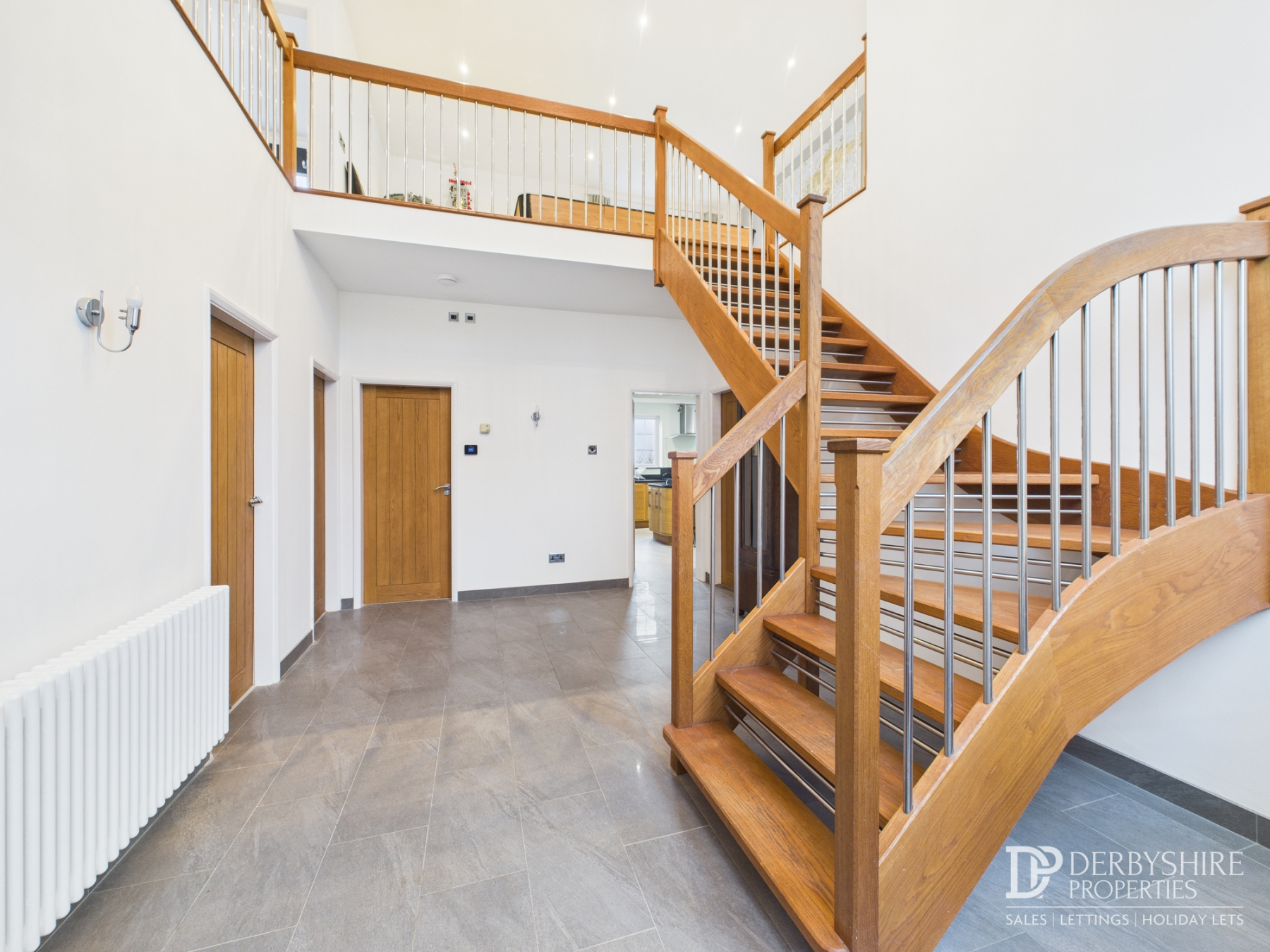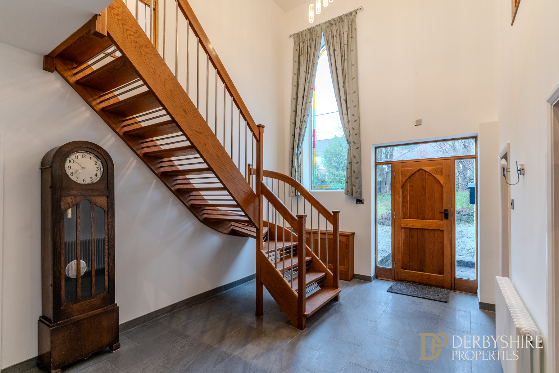 Entered via a solid wood front door with adjoining glazed panels, this impressive double-height reception hall features a striking oak staircase, picture window, tiled flooring, decorative wall lighting, and period-style radiator, creating a bright and welcoming first impression.