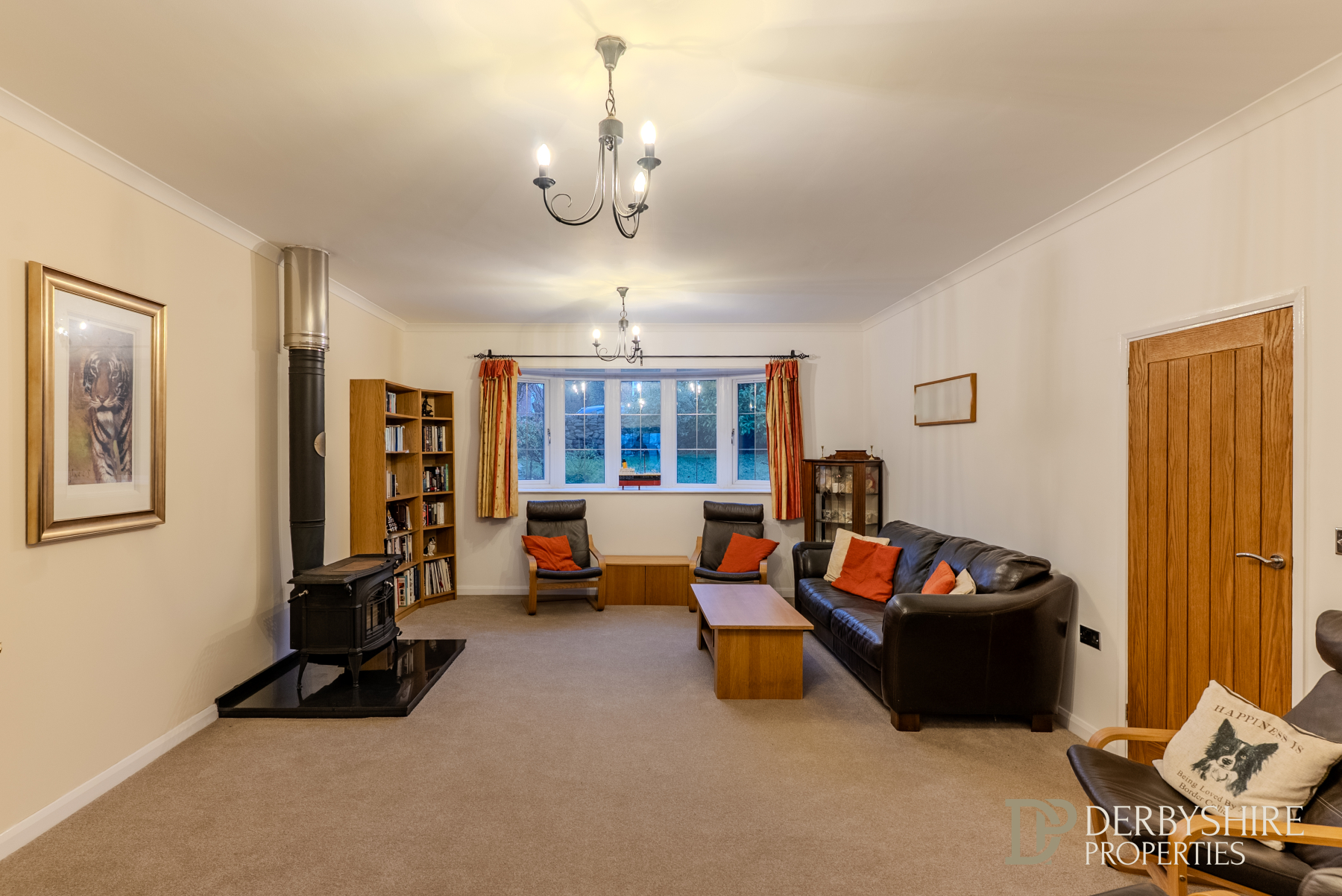 A generously proportioned family space featuring a double-glazed window to the front elevation, decorative coving, period-style radiators, and a cast-iron log-burning stove set within an exposed chimney breast on a raised polished hearth.