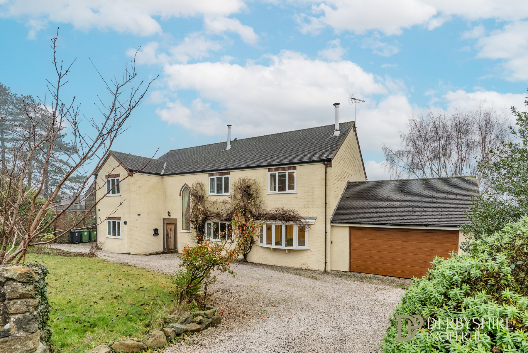 To the front elevation is a sweeping gravel driveway providing access to the property and the attached double garage. The well-maintained frontage features a lawn with well-stocked flowerbeds and borders, mature screening to neighbouring properties, and an attractive stone wall boundary.