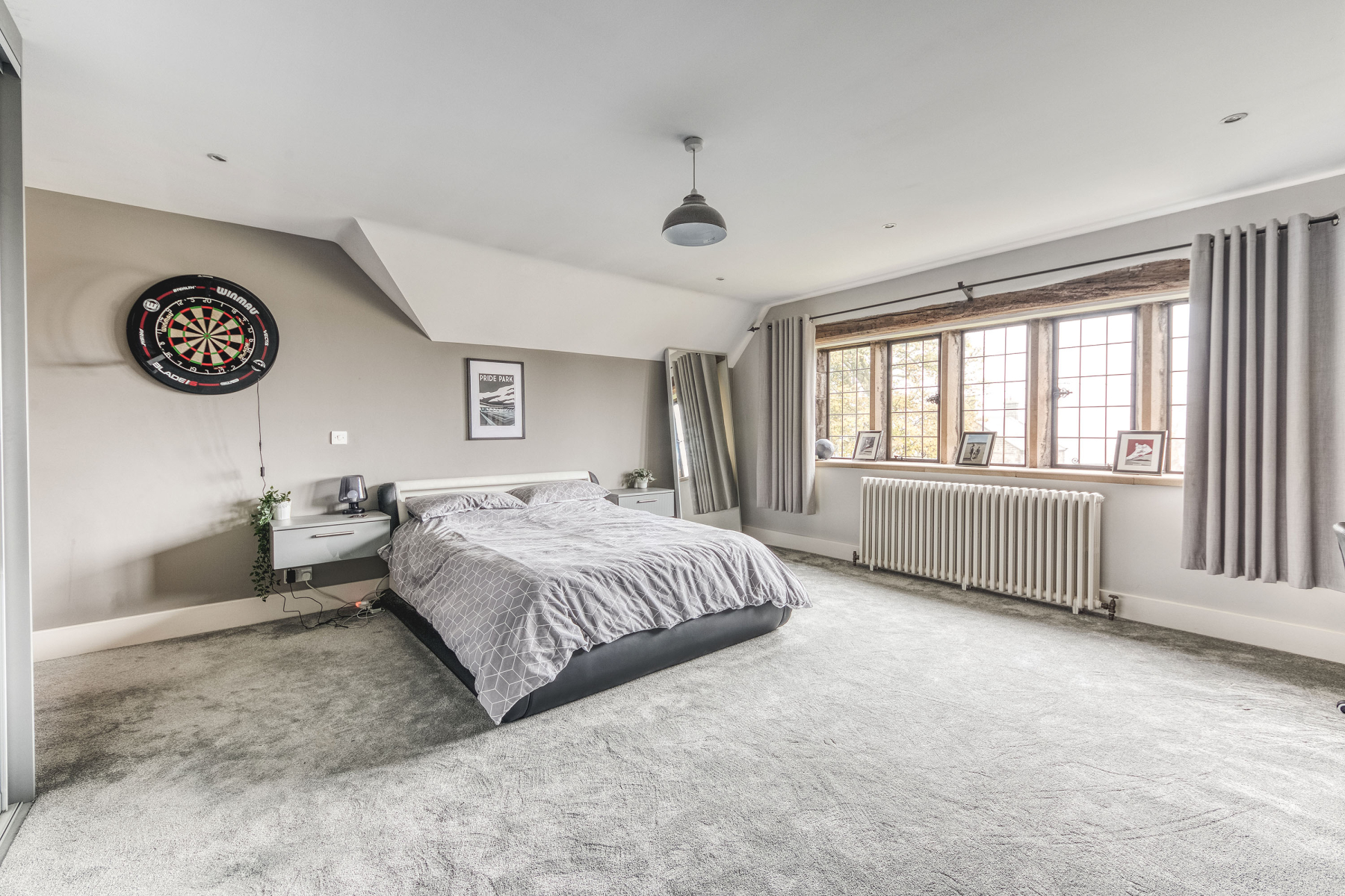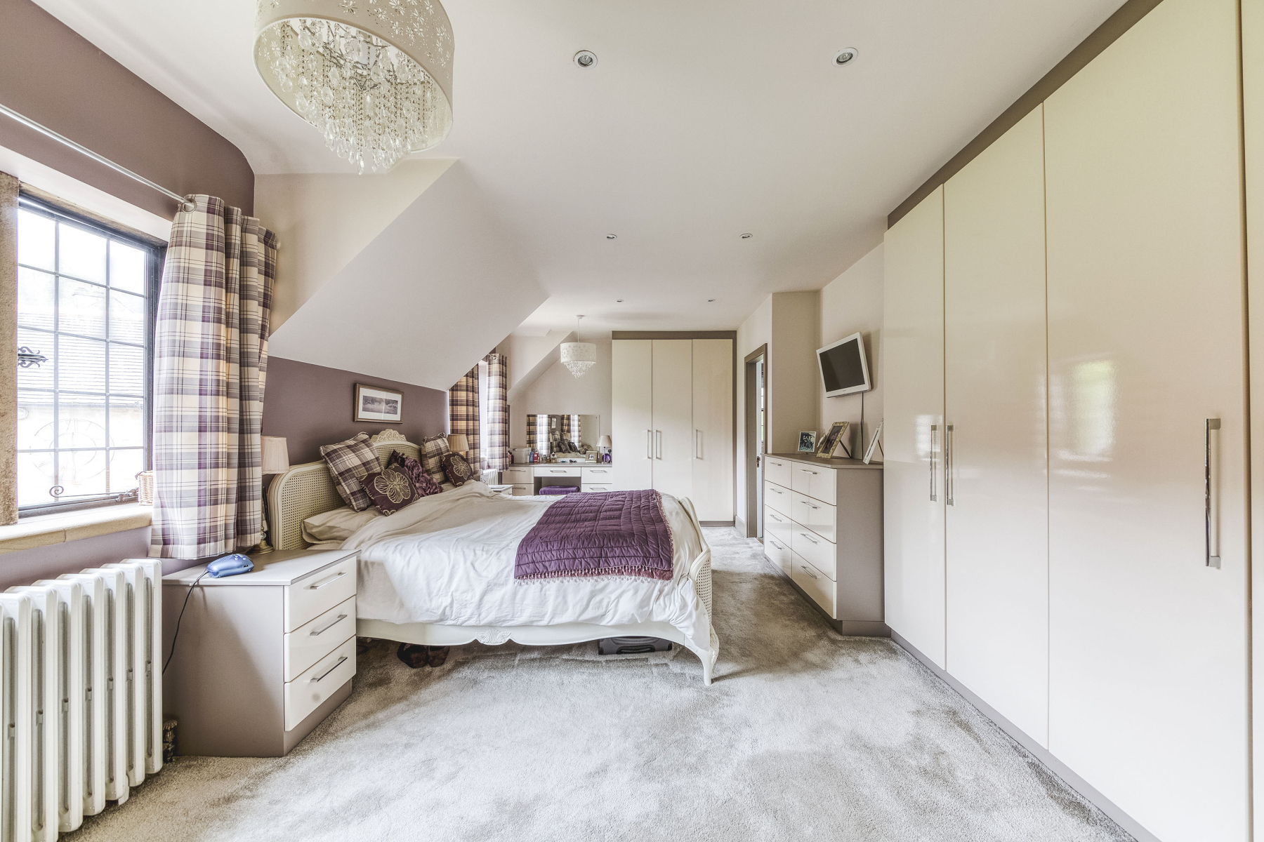 17' 10" x 16' 0" (5.44m x 4.88m) Original window with exposed timber lintel to the front elevation providing elevated views over countryside, wall mounted period style radiator, TV point, spotlights, in-built modern wardrobes with sliding frontage. The focal point of the room is a cast-iron feature fireplace.