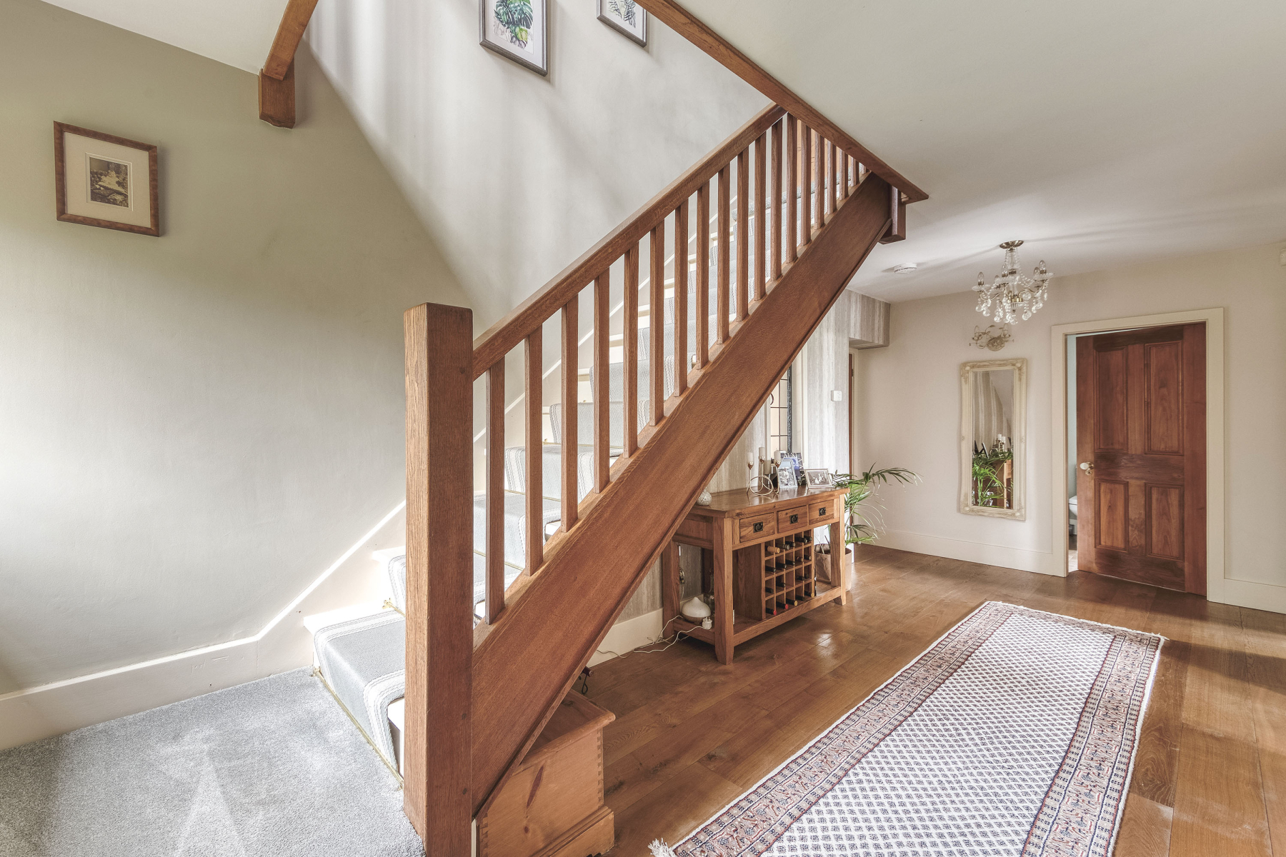 7' 10" x 20' 9" (2.39m x 6.32m) Located at the side elevation is this spacious, light and airy entrance hallway with solid wood floor covering, staircase to 1st floor landing, wall mounted period style radiator and decorative wall lighting.
