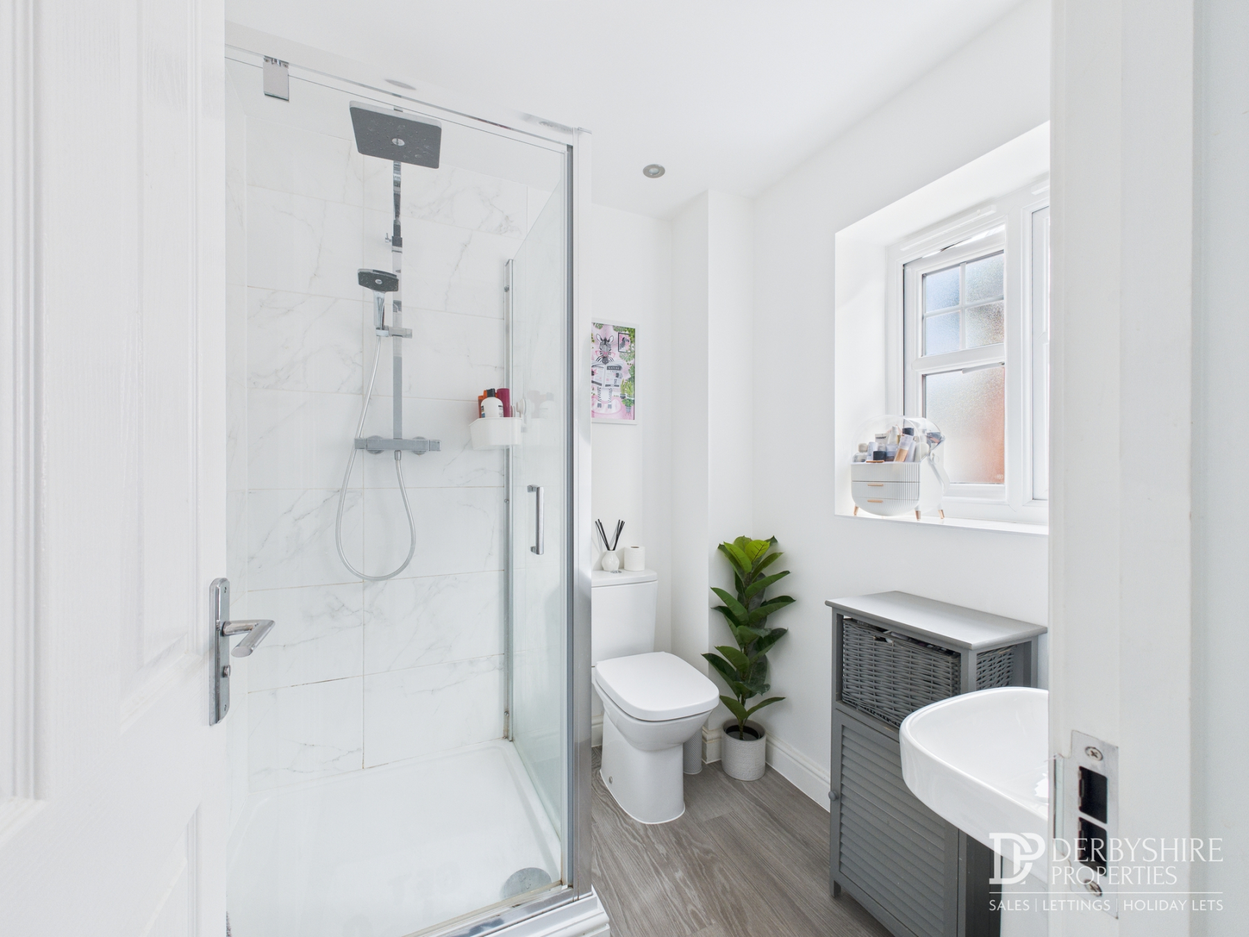 1.83m x 1.80m (6' 0" x 5' 11") A tiled three piece suite including; Shower cubicle, pedestal handwash basin and low level WC. Wall mounted heated towel rail, double glazed obscured window to rear elevation, shaving point and ceiling fitted extractor fan complete the space.