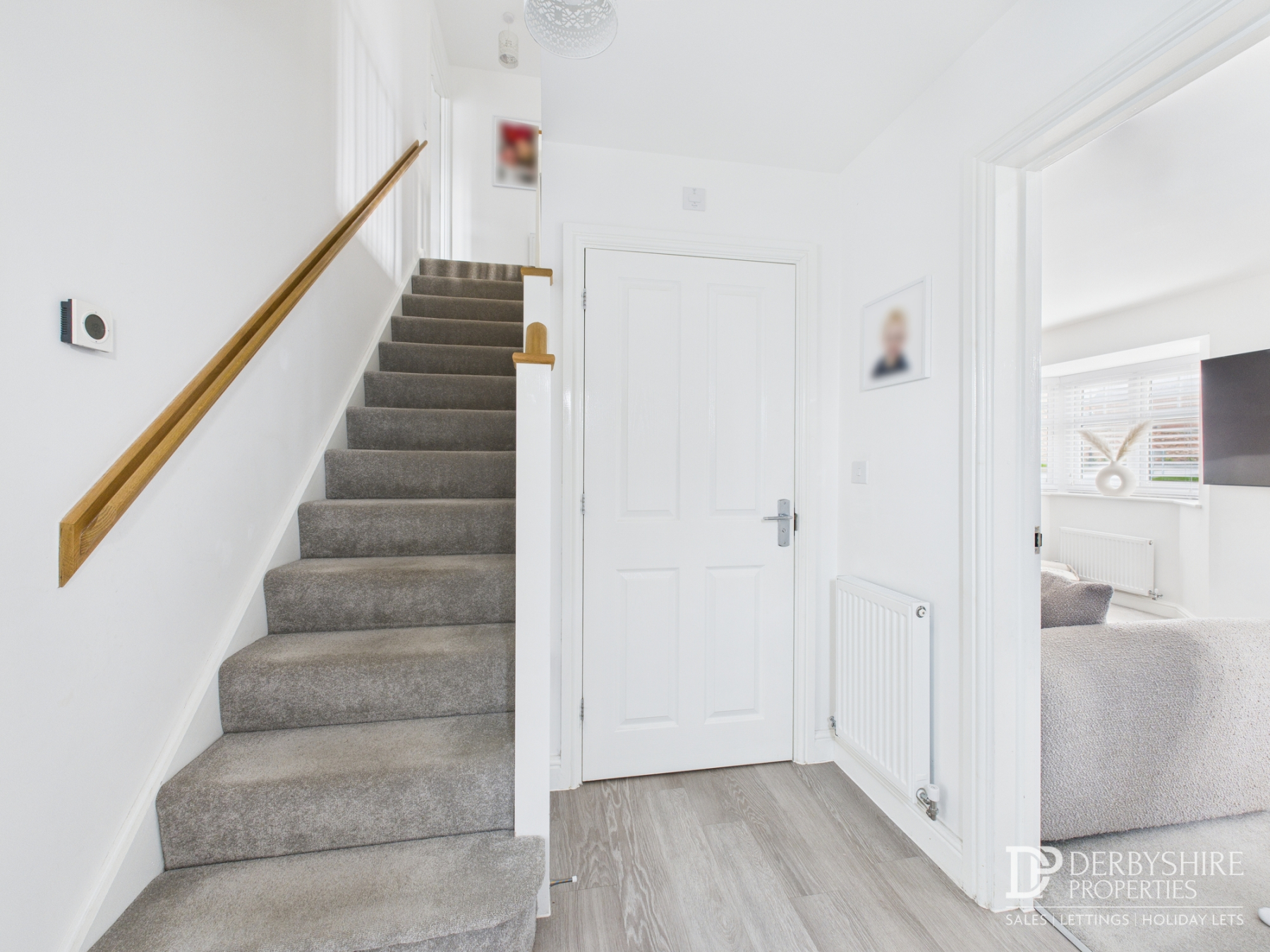 Accessed via composite door to front elevation with wood effect flooring, mini wall mounted radiator and carpeted stairs rising to first floor. Doorways to;
