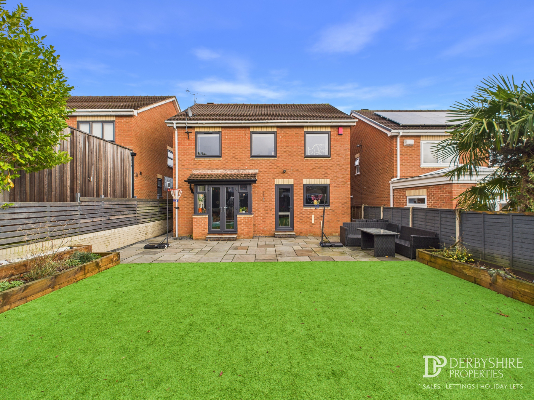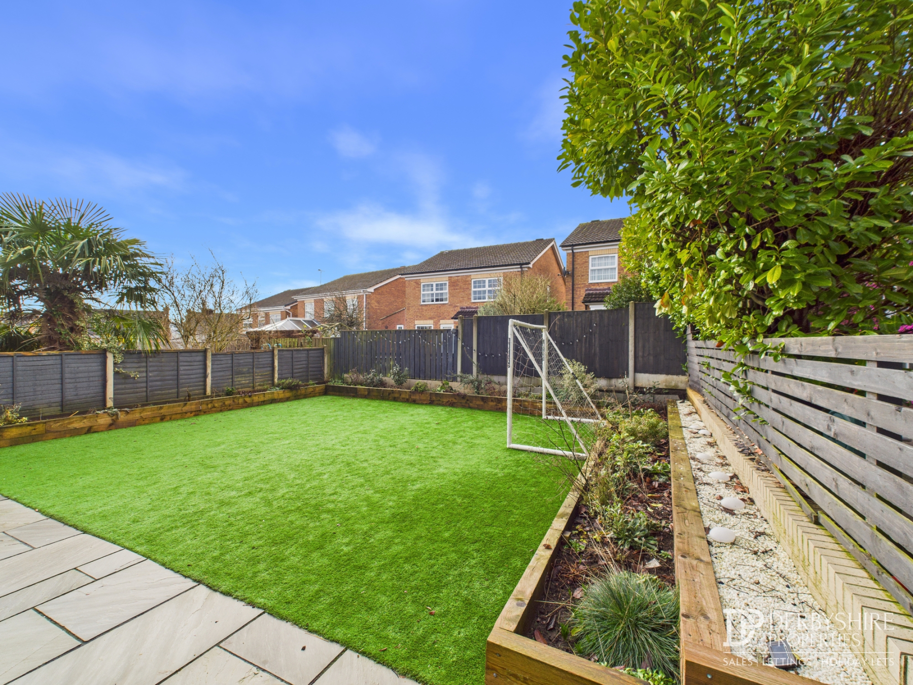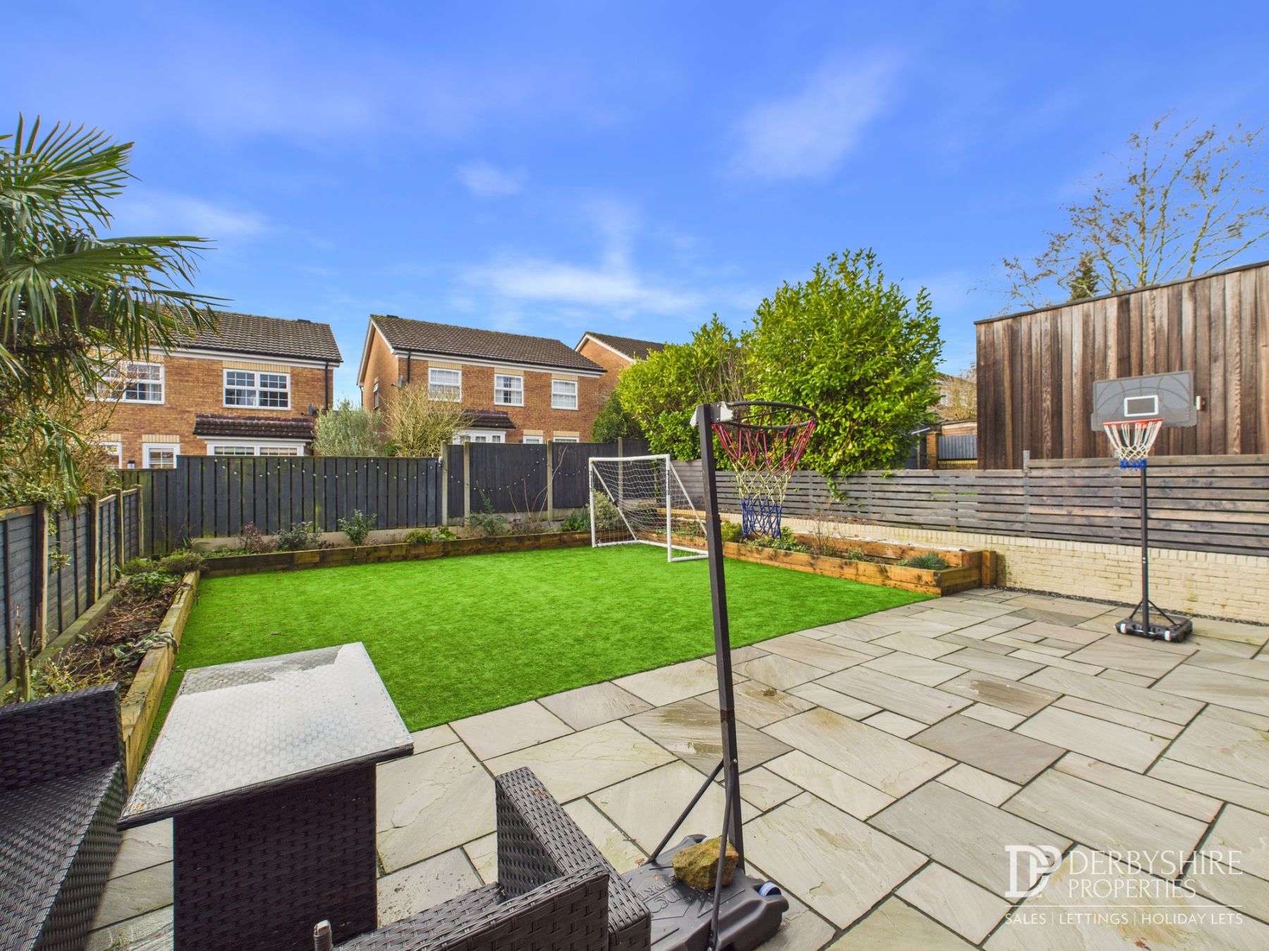 The professionally landscaped rear garden features a full-width porcelain patio terrace, perfect for outdoor entertaining. Beyond is a generous area of AstroTurf lawn with raised, stocked borders finished with sleeper edging, all enclosed by timber fence boundaries.
