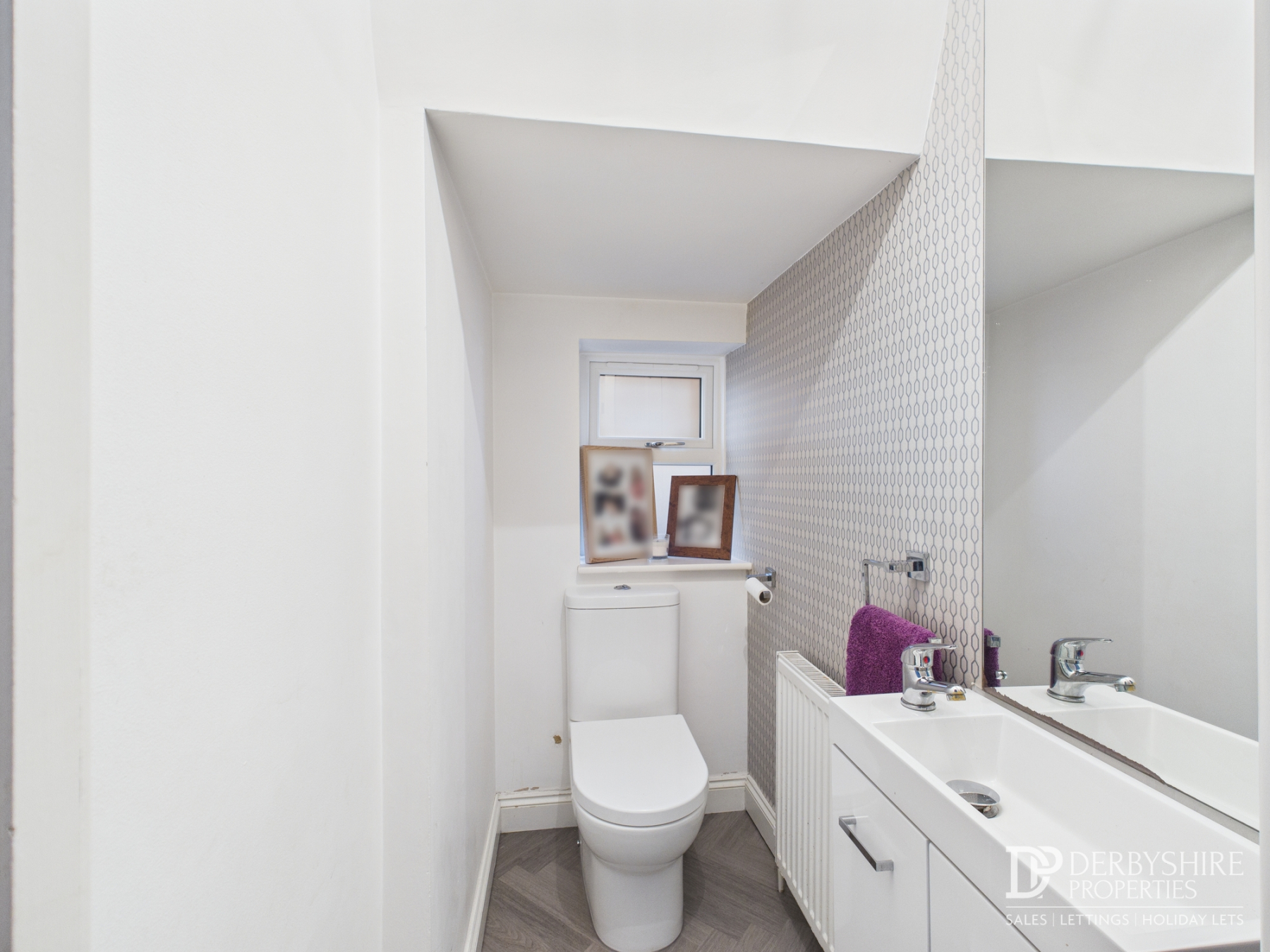 Comprising a low-level WC and slimline vanity unit with inset wash hand basin and storage beneath. LVT flooring, wall-mounted radiator and double glazed obscured window to the side elevation.