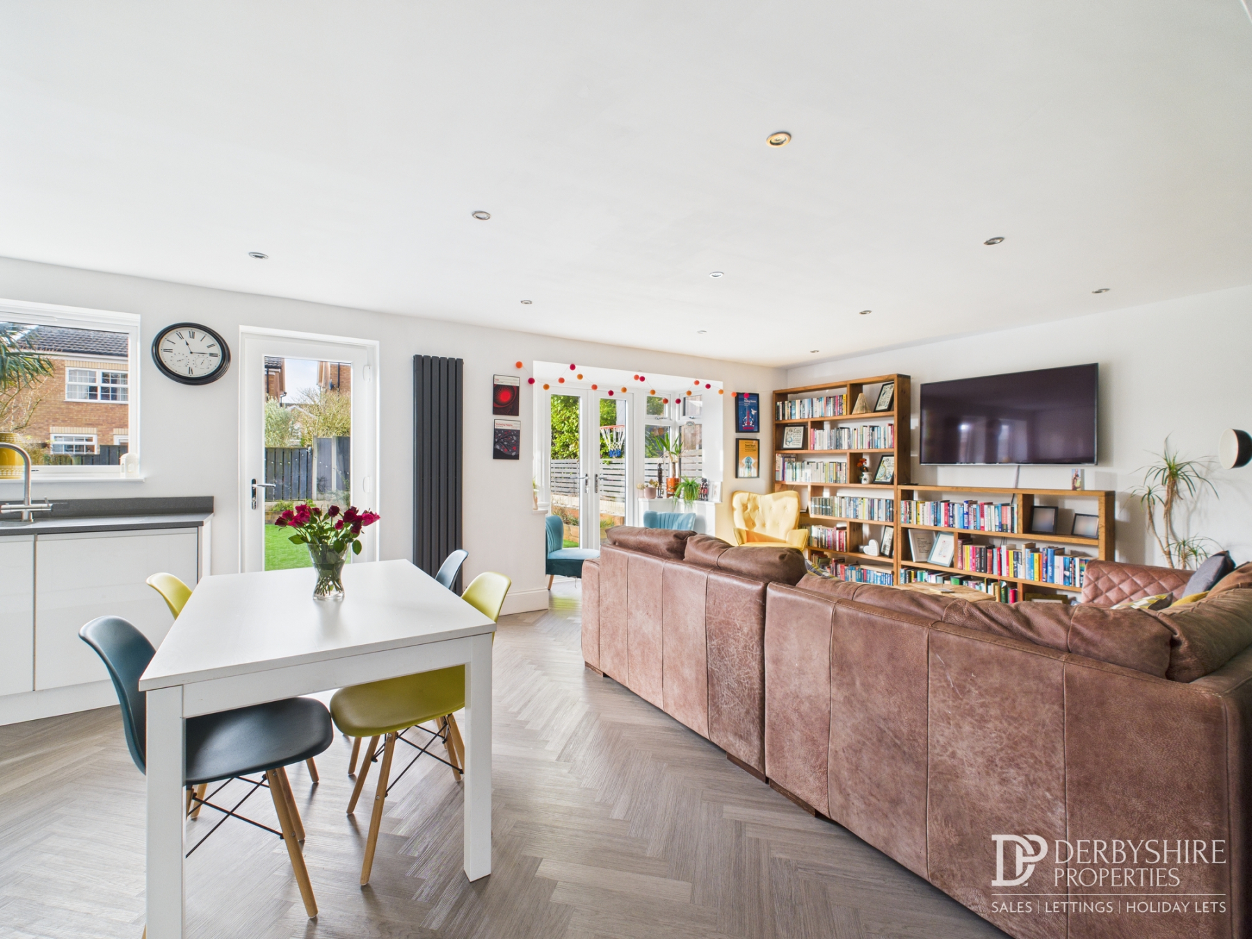 The dining area provides ample space for family dining, while the living area continues the LVT flooring and features double glazed French doors with adjoining side windows opening onto the rear garden, TV point and ceiling spotlights.